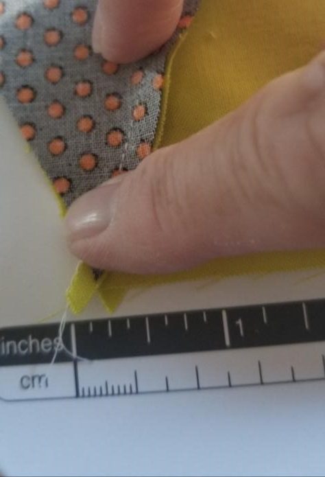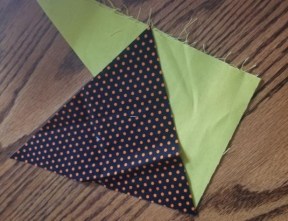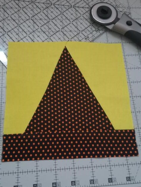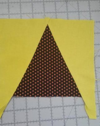 Align the print triangle fabric “down” ¼” from the point of the background triangle (yellow fabric).