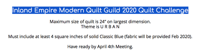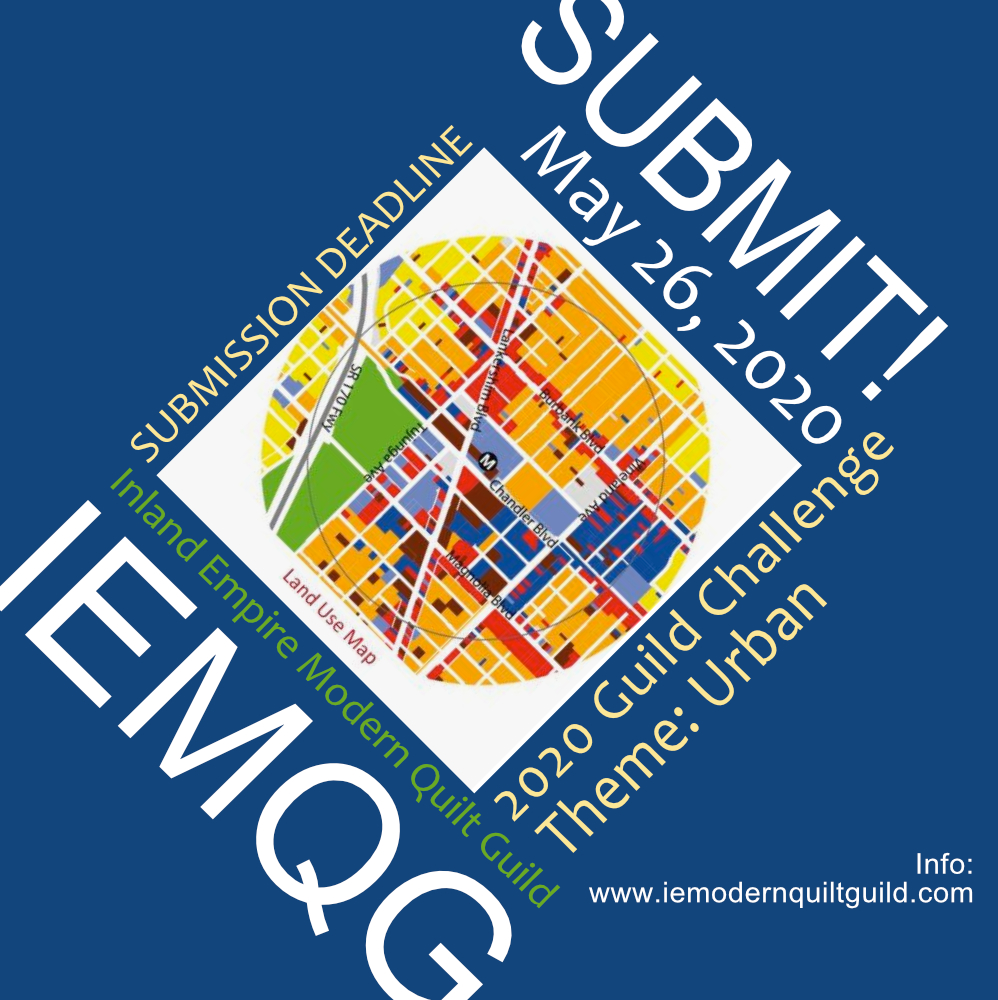 We are excited about the entries we’ve received for our Urban Challenge, originally set for an April reveal, but now set for a June 13th reveal at our upcoming Zoom Meeting. We just wanted to remind you about the parameters of our guild’s 2020 challenge and encourage you to get making — it’s a small quilt, so it can be made quickly, in a day or maybe two.