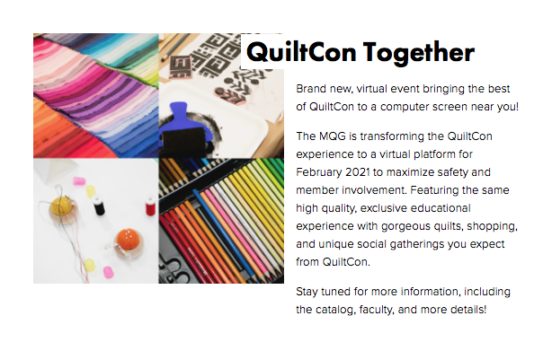 One silver lining to the cancellations we are experiencing is the transformation of our national quilt show, QuiltCon, into a virtual quilt show. Those of us who wouldn’t have been able to travel to Atlanta can now participate in QuiltCon. Emails will come to you directly from MQG, so watch for announcements!