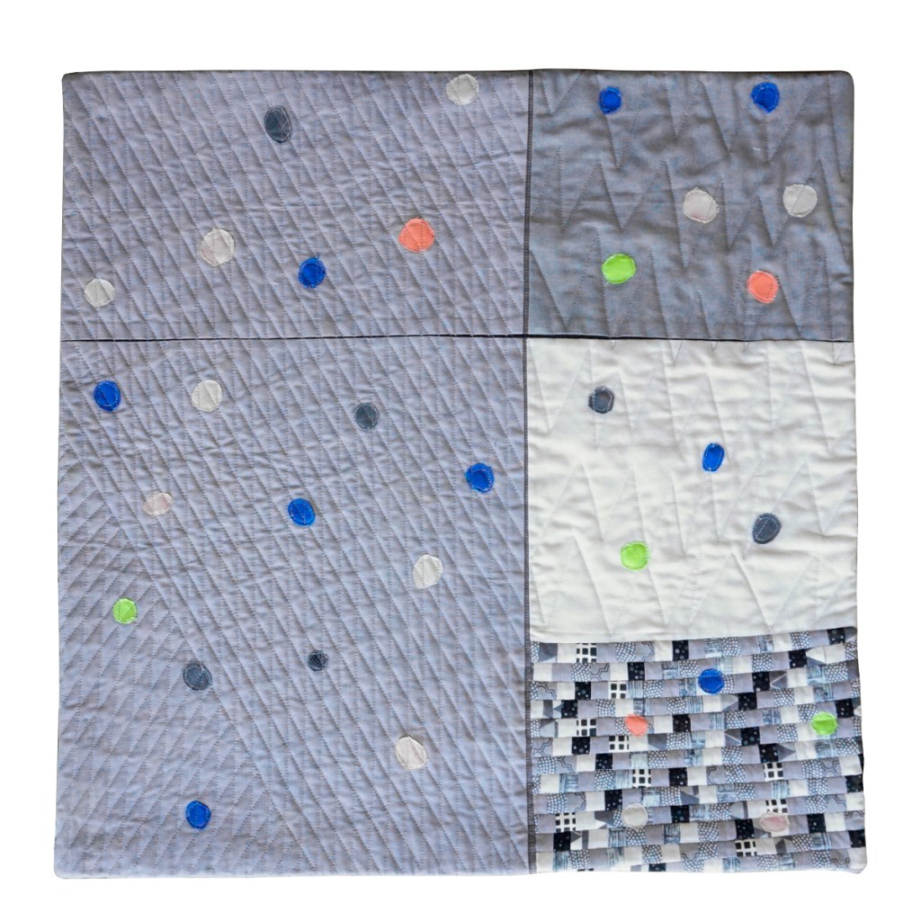 Inspired by the Jacquie Gering/Katie Pederson pattern for the Fiesta wall quilt in Quilting Modern as well as my view of sidewalks. From the green strip walkways of my neighborhood, to the miles of San Francisco pavement, and the cobblestones of my one (so far) European adventure the presence of gum blobs — apparently just spit out by a person onto the very path they are walking — has always puzzled me. Facing binding with my first attempt at mitered corners for that type of binding.