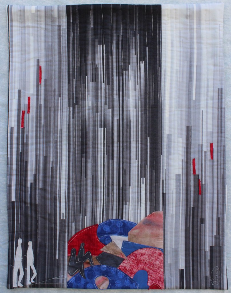 The narrow striped fabric in greys reminded me of tall modern buildings. I used raw edged applique to show the tents and clutter jammed below the modern looking skyline. The required blue challenge fabric is part of the homeless encampment. I took liberties to include politically incorrect stereotypes of white people walking below the tall buildings reaching to the daylight, and people of color huddled below the dark sky, living in makeshift spaces on the sidewalks, in order to emphasize the “Haves and Have Nots” theme.