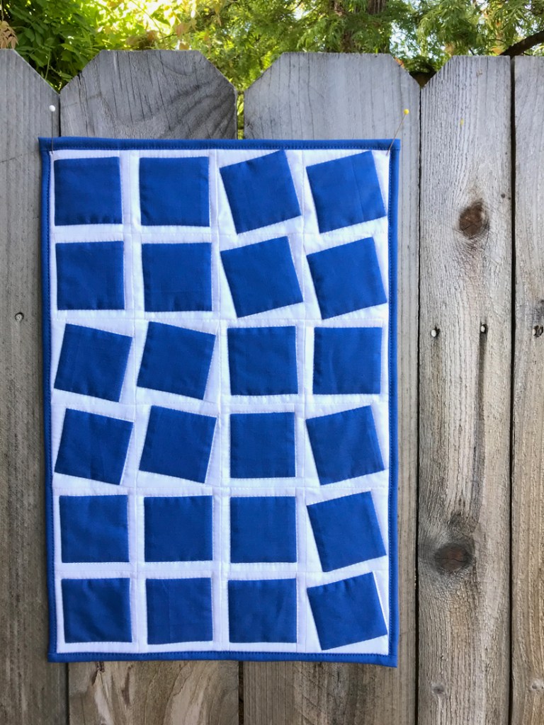 Thanks to everyone who entered our 2020 Inland Empire Modern Quilt Guild Challenge. We had the theme of Urban, the requirement to use a minimum of 4″ of blue fabric (we handed out the swatch), and the size restriction of the longest side measuring 24 inches. We’ve gathered them all together; they are presented in alphabetical order. All dimensions are listed width by heighth.