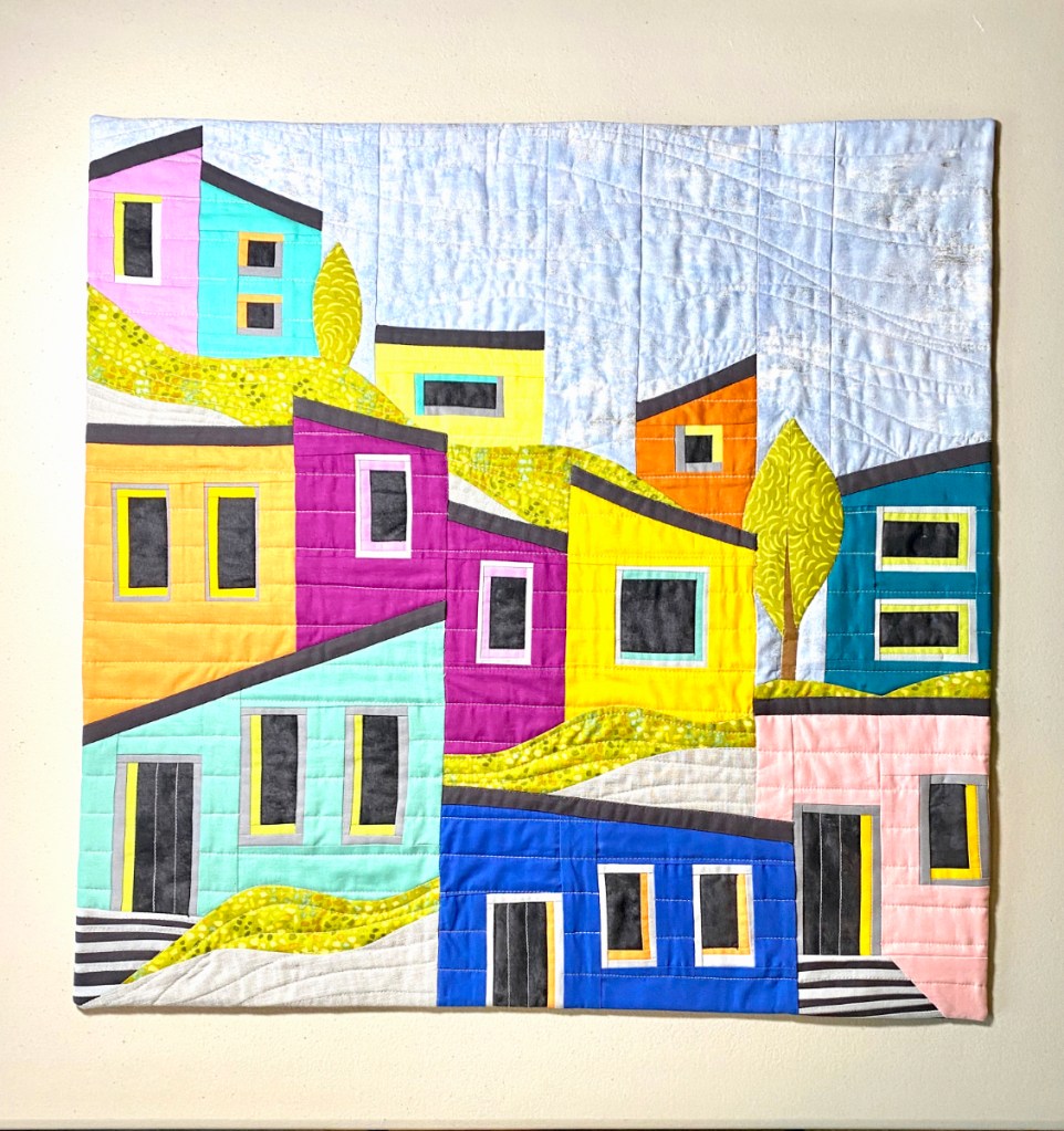 I am pleased to submit my original improvisation of Guanajuato, the most colorful city in Mexico. I have always loved photos of that city showing the unregulated application of color to the neighborhoods trailing up the hillsides. All of my fabrics came from stash except for the lapis colored house in front and the sky fabric, a metallic grunge that looks way better in person. I placed purposely wonky steps at the base to ground the neighborhood. I gave a little perspective to the windows to add interest. I added some gray linen and speckled green for textured landscaping. I have not mastered free motion quilting so I used a walking foot. I decided on a faced binding to make it more modern. This was so very challenging for me but fun as well!