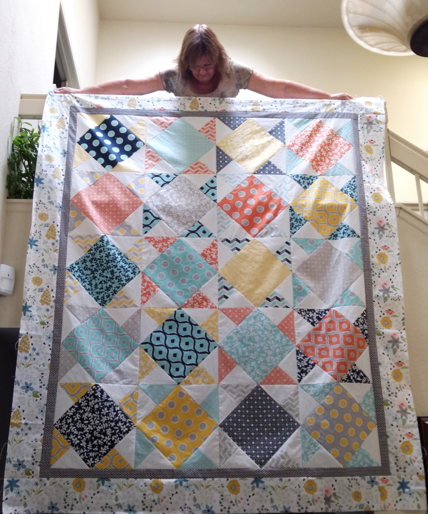 Quilt Details: This was a Pass Patchers Quilt Guild June 2020. This measures 54″by 70″  using my stash. I always wanted to make a quilt of these colors…opportunity called.