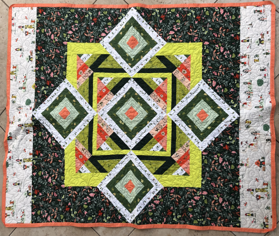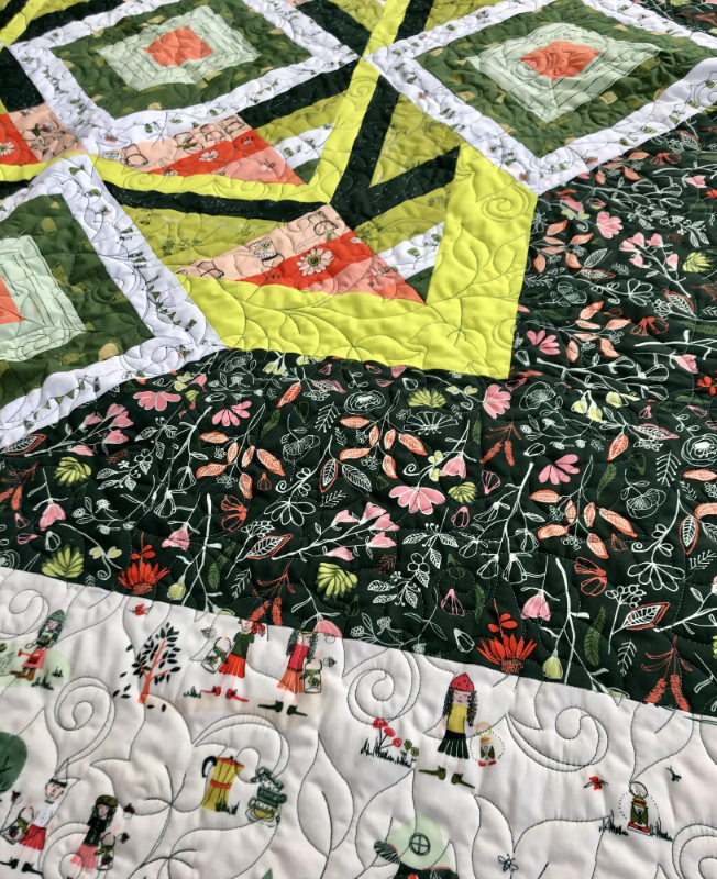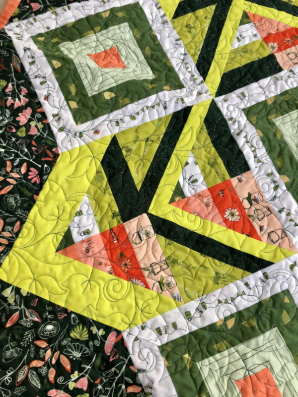 Quilt Details: This quilt I made from the AGF line Dew and Moss and was made using the pattern Gnomsville which I downloaded from the AGF website. I quilted it using the pattern Oleander. I’m especially proud of this quilt because Art Gallery Fabrics shared it on their website. Sarah is one of our newest members, and is a long arm quilter who is open for business!