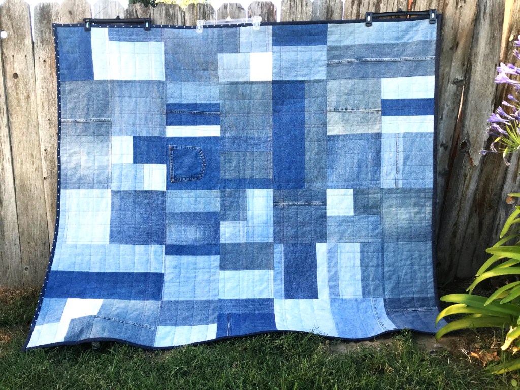 Quilter’s Statement: This is a jean quilt for my daughter and family to take in their travel trailer. I think this will be a one time experience in quilting. Whew, this was a heavy one. I used a layer of thoroughly preshrunk flannel instead of batting because this quilt does not need any additional weight! Backing and binding is a lightweight denim from Joann’s.