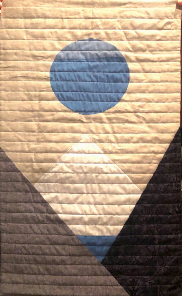 Maker’s Statement: For niece, Ericka, graduating from college with double major in Creative Design and Economics From an Institute in Paris. She described her style as Modern Minimalist, preceding black, grey and blue. I used linen I had purchased at quilt show in France.