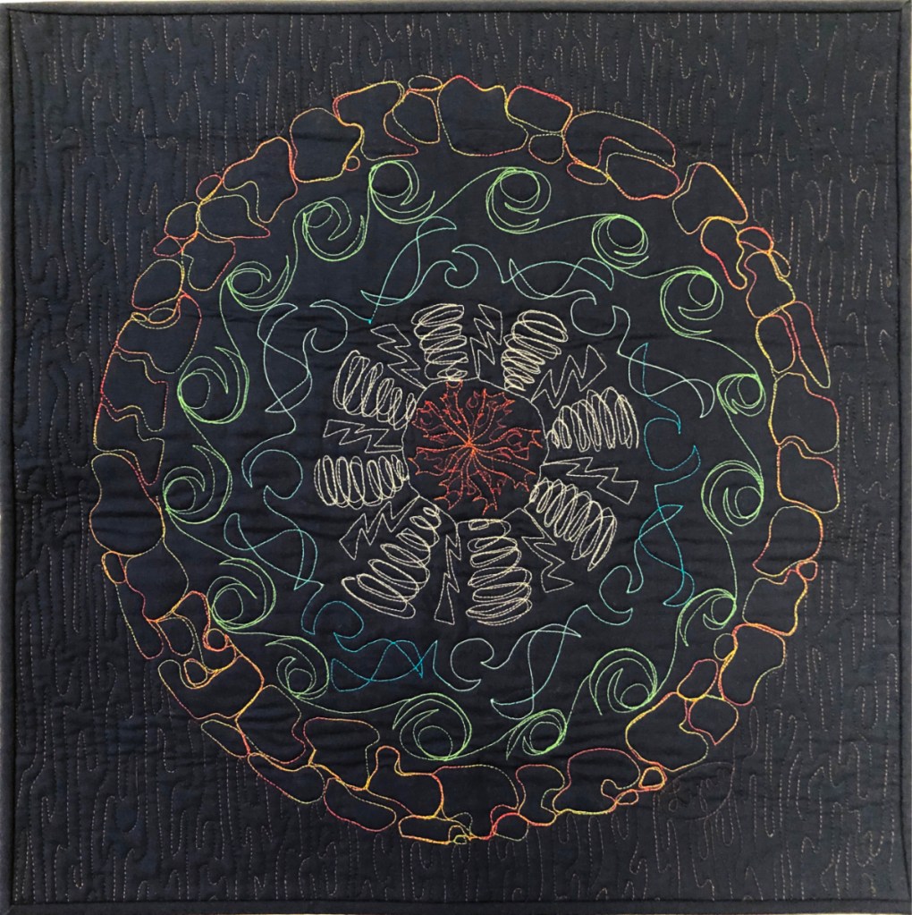 Statement: I watched Mel Beach stitch mandalas on a Quilting Arts TV show. I made some wedges, then stitched in each web, free hand, no marking, as she suggested. This is the result.