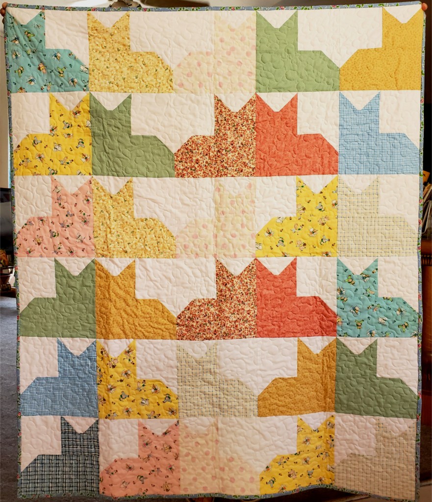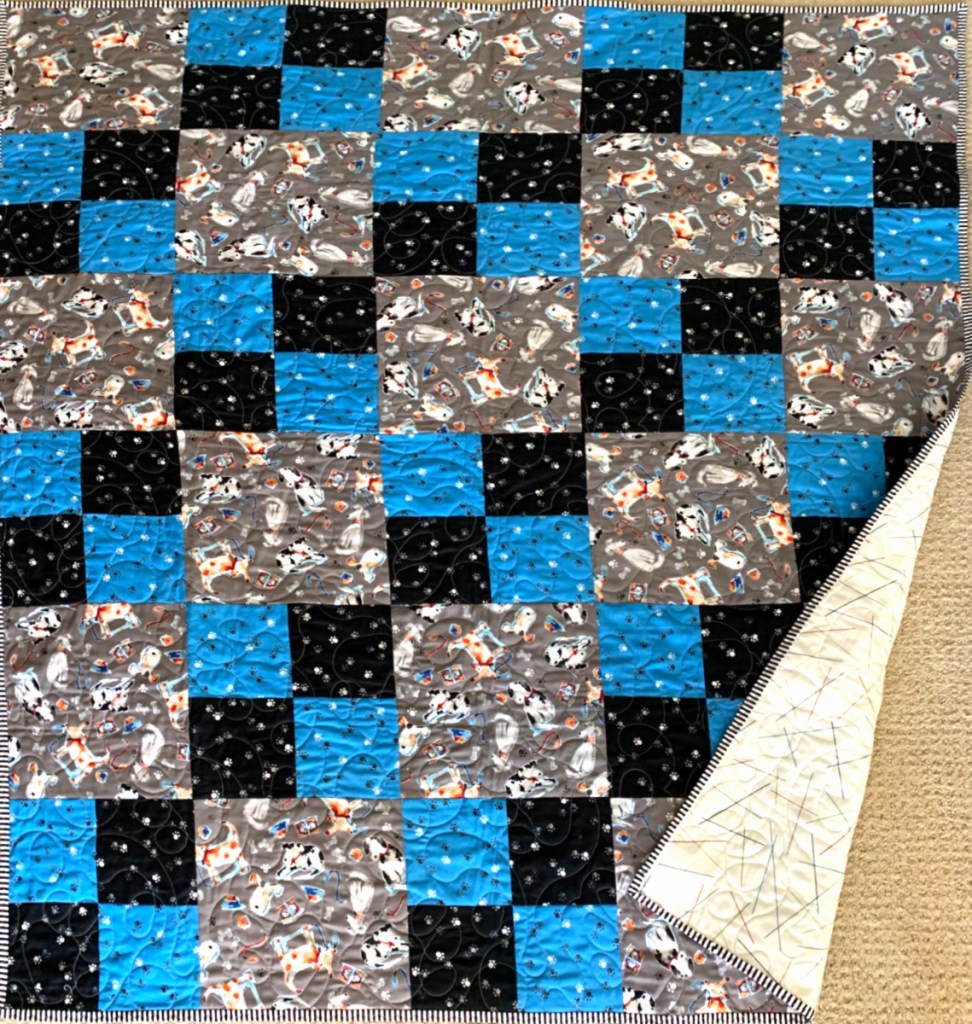 The quilt on the right is a charity quilt. I used the pattern for three 1 yard fabrics, but I did not want to do borders, so I used an extra 1/4 yard of the focus fabric and stripe binding. It finished at 48″ x57.”
