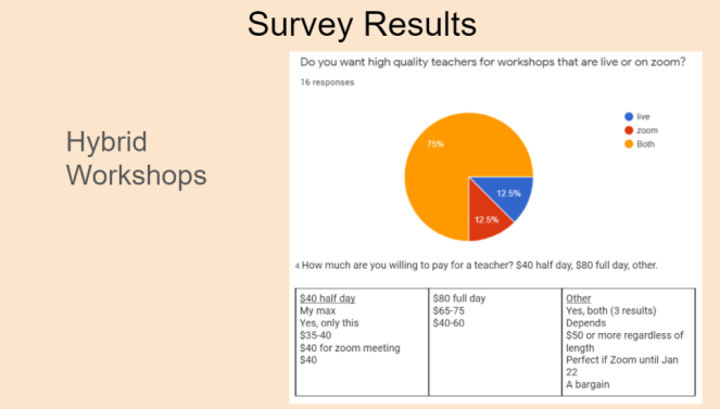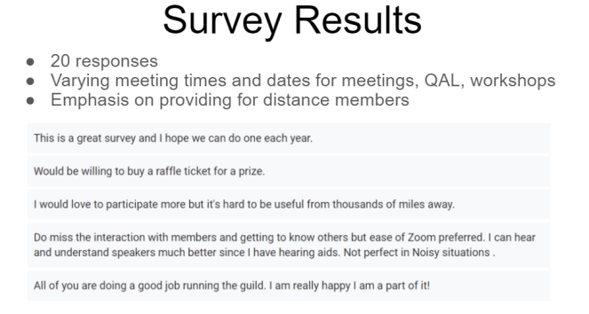 Survey Results: Laura shared a summary of the recent survey that 20 members responded to. Members identified benefits of having in-person meetings, zoom meetings, and a combination. There was not a majority consensus on the kind of meetings we should have in the future. Members appreciate high quality teachers, amount to pay for the classes varied. Members were split on selling items no longer used but were more positive about purchasing other’s items to fundraise for the guild. Three-quarters of our members agreed to work on a community quilt for QuiltCon. Laura took an informal poll on an in-person meeting time as the board is considering changing from 2 pm to 10 am. There was much discussion about times, dates, and ability to participate if things change. The board will look at sending out another formal survey to all members, with closed-ended questions, before deciding about future meeting times/dates. The survey results are as follows.