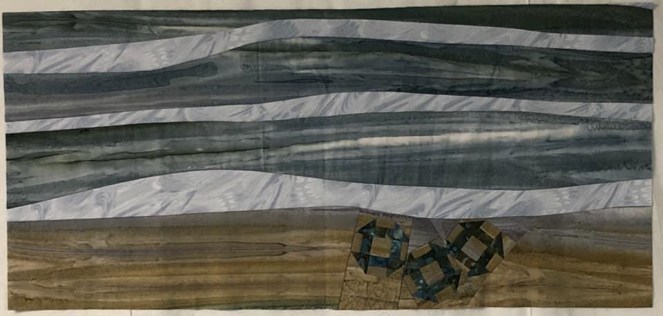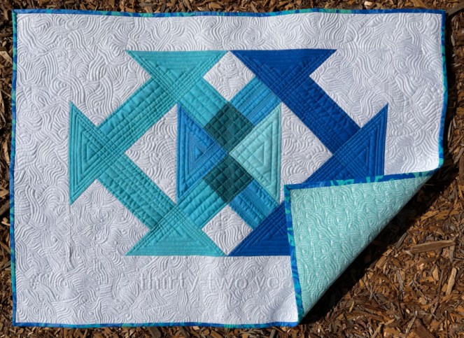 I merged and rotated two churn dash blocks, and after I finished the stitching, I sat and studied it. I really liked where the deep blue and the aqua merged in the middle retaining something of themselves. The colors also blended by giving a little of their color to the other, making a new hue. Yep, I thought, reflecting on our recent thirty-second wedding anniversary, this little bit of a quilt is just like marriage, so I stitched in the number of years from our recent anniversary in the quilting. Thanks to the Guild for motivating us with this challenge!