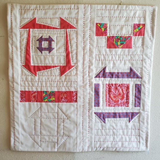 I wanted to play with scale. The churn dash blocks are 1-1/2 and 2 inches. The entire piece is only 9″x9”.