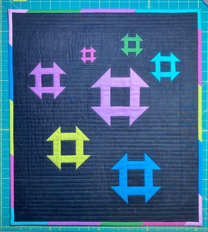 I started by making the smallest churn dash I could (1.5” finished) and then increased my HST’s by .25 inch each I used a cool bright color palette and started by making the smallest churn dash I could at 1.5”. Then increased the block size by 3/4 inch each time up to 6 inches. I improvised an alternative layout, and finished it off with modern channel quilting and a scrappy binding.