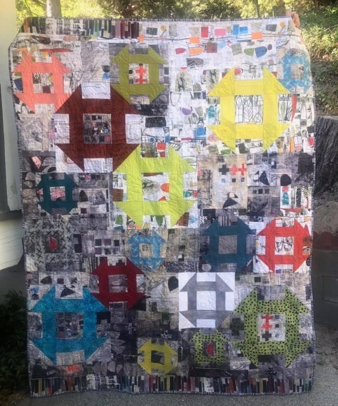 I have a fascination with Churn Dash blocks and with Marcia Derse fabric (This quilt features “Art History 101” and “Treasure Hunt”) I met Marcia at the Pacific Northwest Modern Quilt Show in Portland. I created my own pattern, which we often do with Modern Quilts. I’ve used Marcia Derse fabric in a number of quilts and was curious how it would function as the background fabric. This quilt is called “Curiosity.” I love having it on the wall in my office. It’s a constant source of pleasure for me.