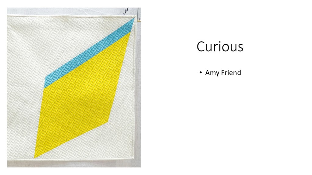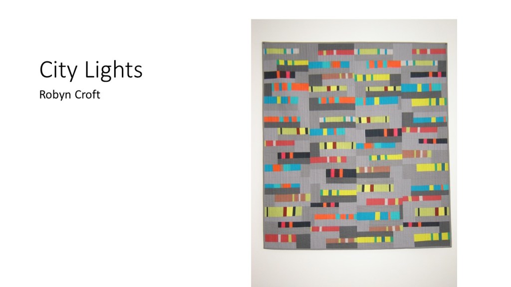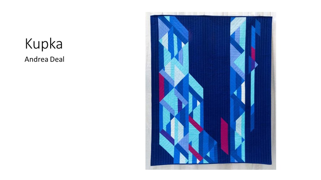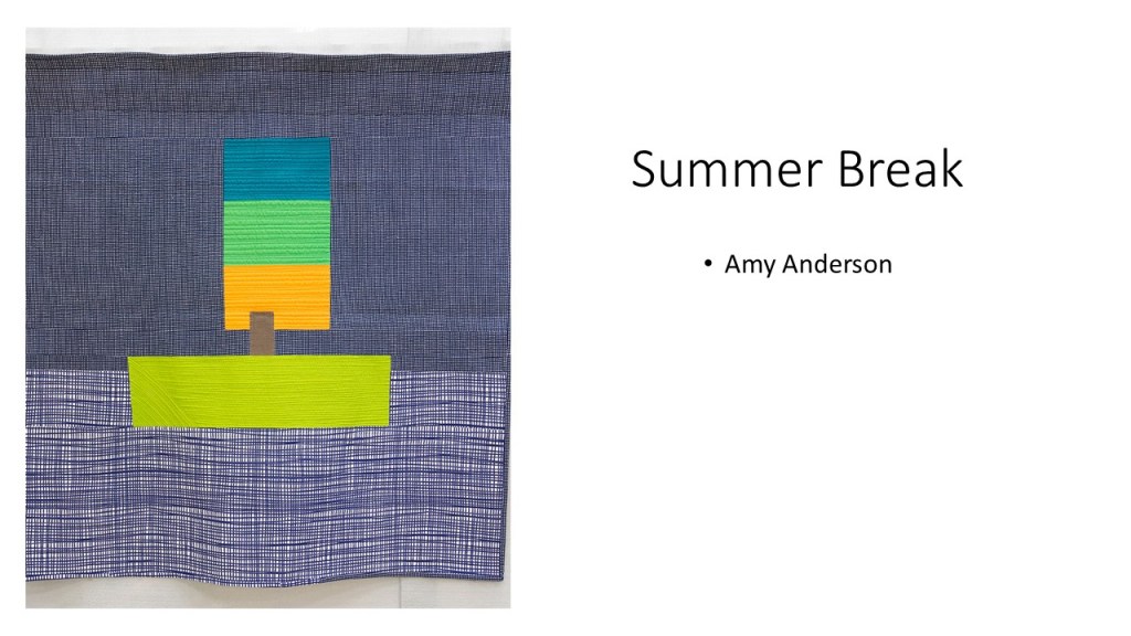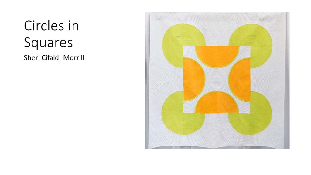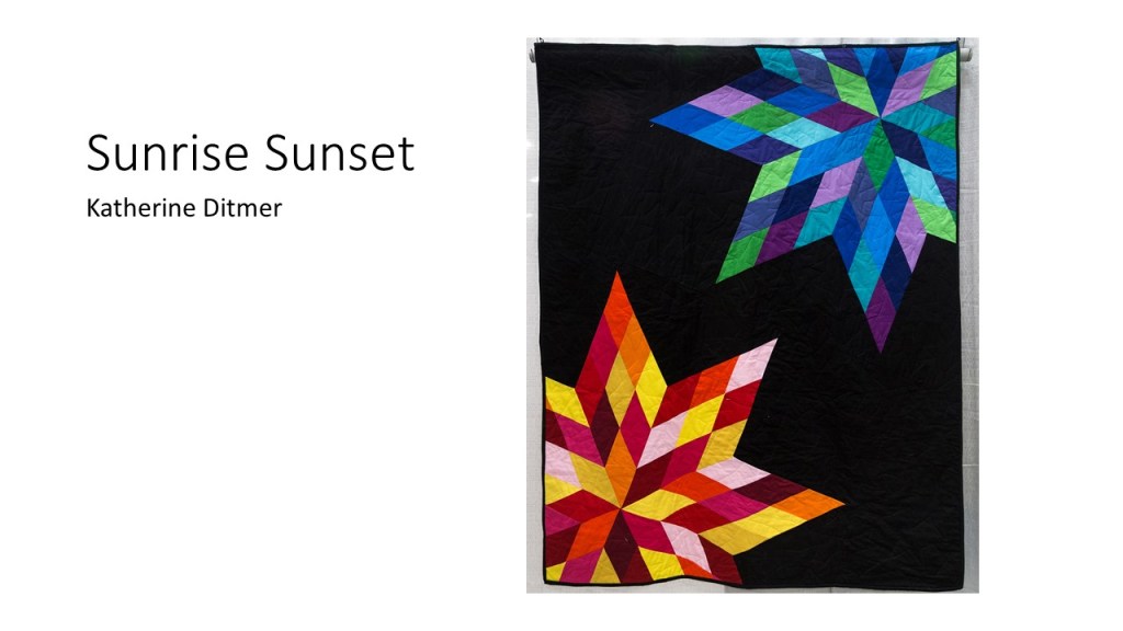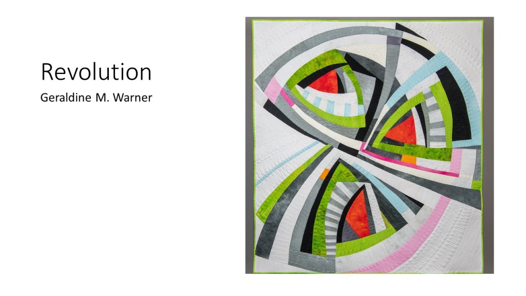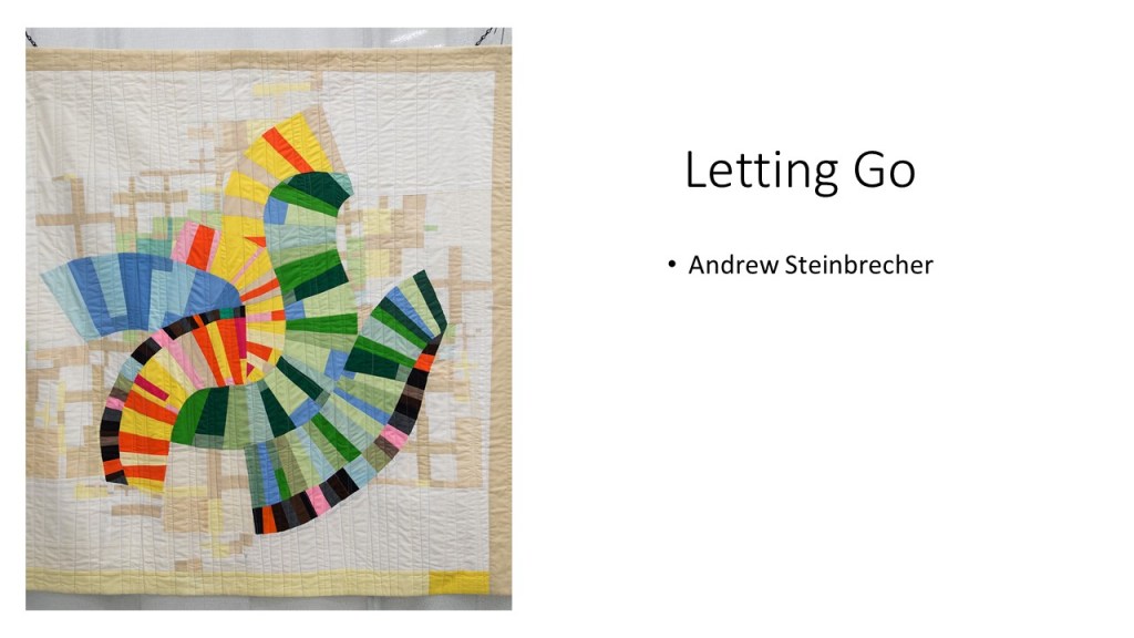 “Improvisational compositions in quilting are similar to improv in jazz music; making things up on the spur of the moment and feeding off each other’s energy. Start with two pieces of fabric and sew them together. Maybe you like the colors together or the shapes created. You don’t know exactly what the final design will look like. Once the process begins, each choice of color or shape influences the next.” – Cindy Gisdela