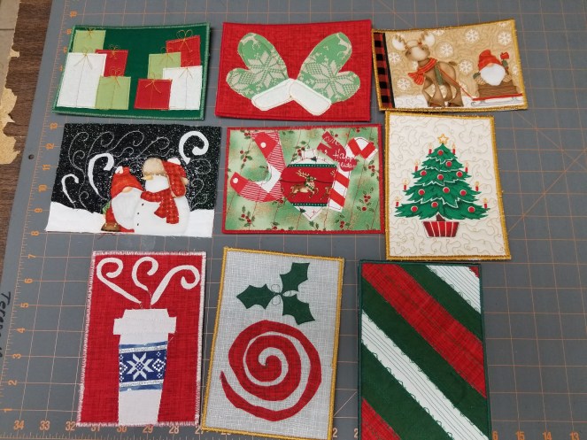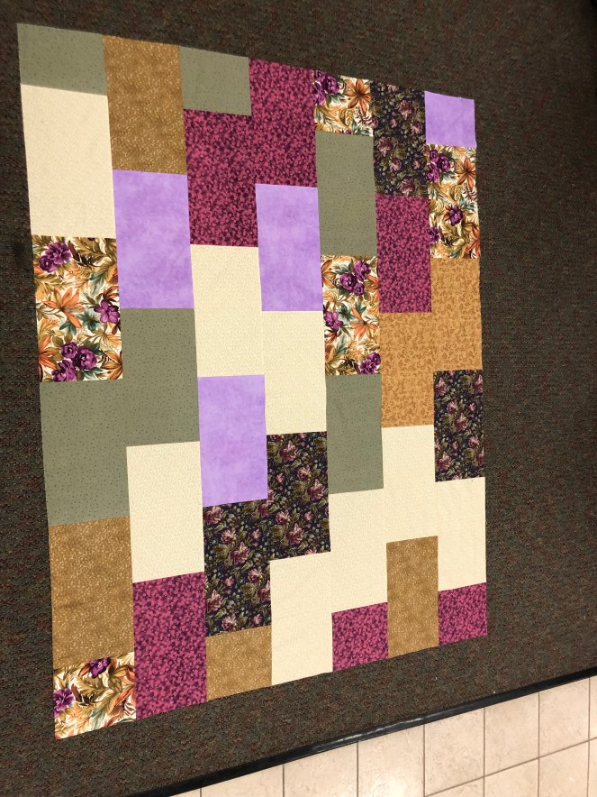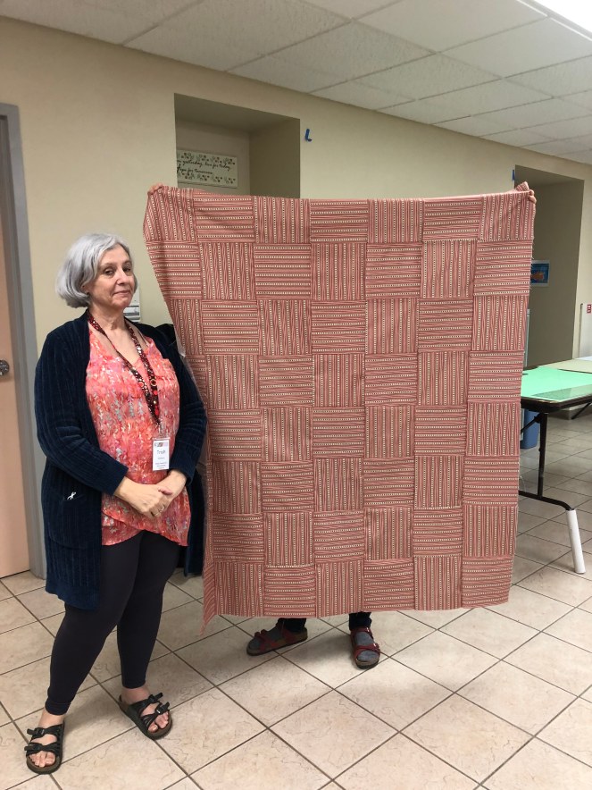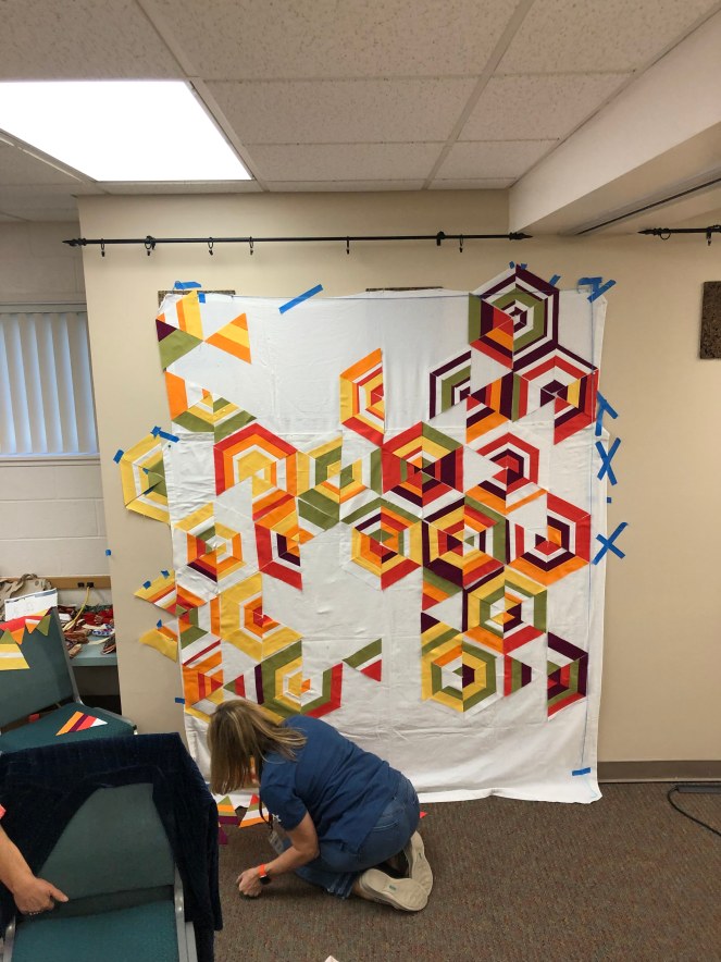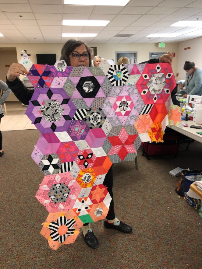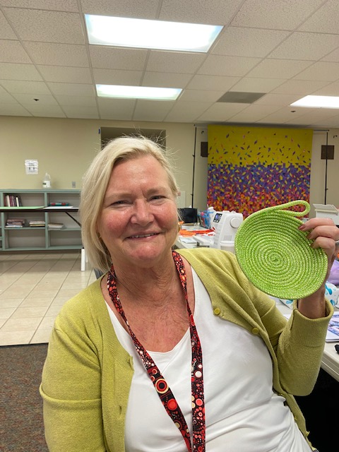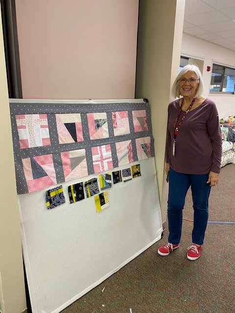 “The retreat was a time for connecting and reconnecting. Several members who have moved, returned and several new faces joined the mix of faces we have come to know on our zoom screens. But this time in person. We have all lived through the common experience of isolation the past year and a half, and now, some cautiously and some explosively, emerged to negotiate the world’s new normal. It was enjoyable to linger over the delicious meals to just chat in person. So eager for the in person connections, we quickly became immersed in all things fabric. We connected and deepened friendships. I enjoyed working on the community quilt, moving triangles around trying to make order and hearing other opinions about the design. Collaboration like this has been missing in my life and was a welcomed and enjoyable experience. We each had our own projects and with each finish a proud moment was captured with a photo. We also worked on luggage tags, rope bowls, and sewing mats with directions shared by members. I worked on the mini mod block swap project. Inspired by the retreat, the beautiful location, and the weaving of stories and experiences, I created an improvisational piece reminiscent of a landscape. The mini mod blocks became rows of sparkle dotted through the scene of cheery colors. Creating with fabric is usually done alone, and has truly been a guiding light during the pandemic. But the retreat returned the activity to the social realm and infused new energy and life into the creations.“