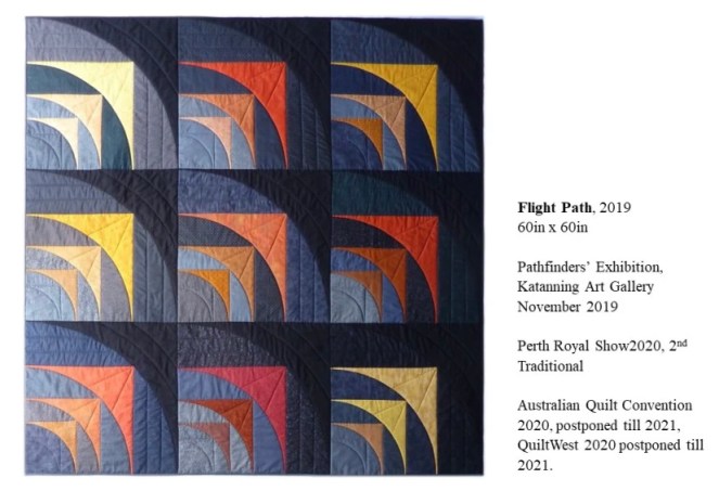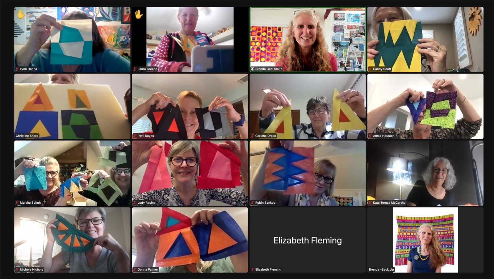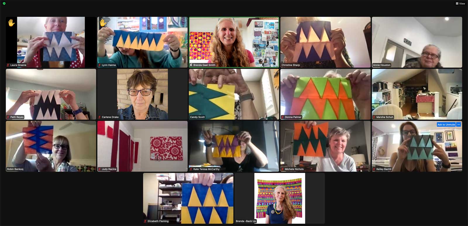 Our general meeting guest speaker, Brenda Gael Smith, delivered an inspirational program, “Driven to Abstraction,” beginning with her brief bio with photos beginning with her childhood in Australia, through her study of law at Washington State University. She took us on a tour of her studio, showed photos of her first quilt, made from seersucker, and the baby quilts that redirected her career from Law to quilting. She shared how nature inspires her modern geometric and linear quilt designs.