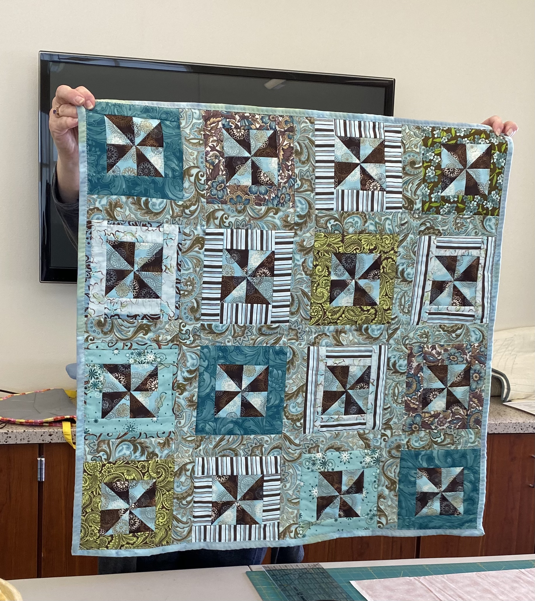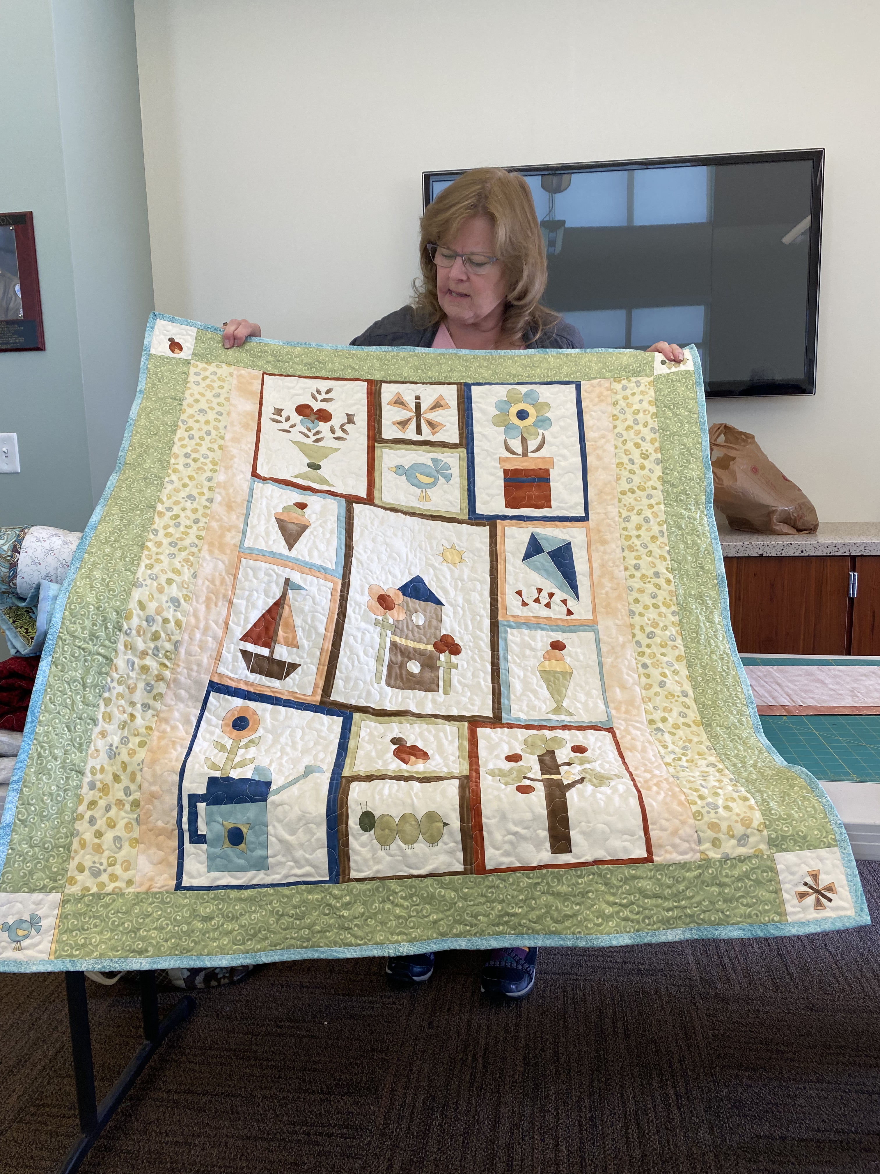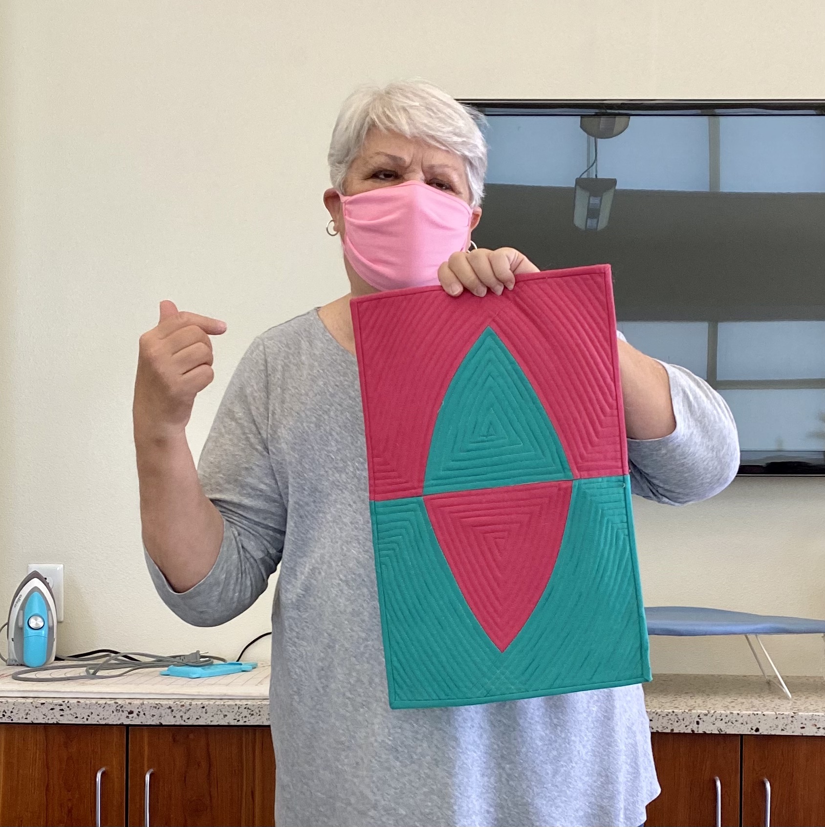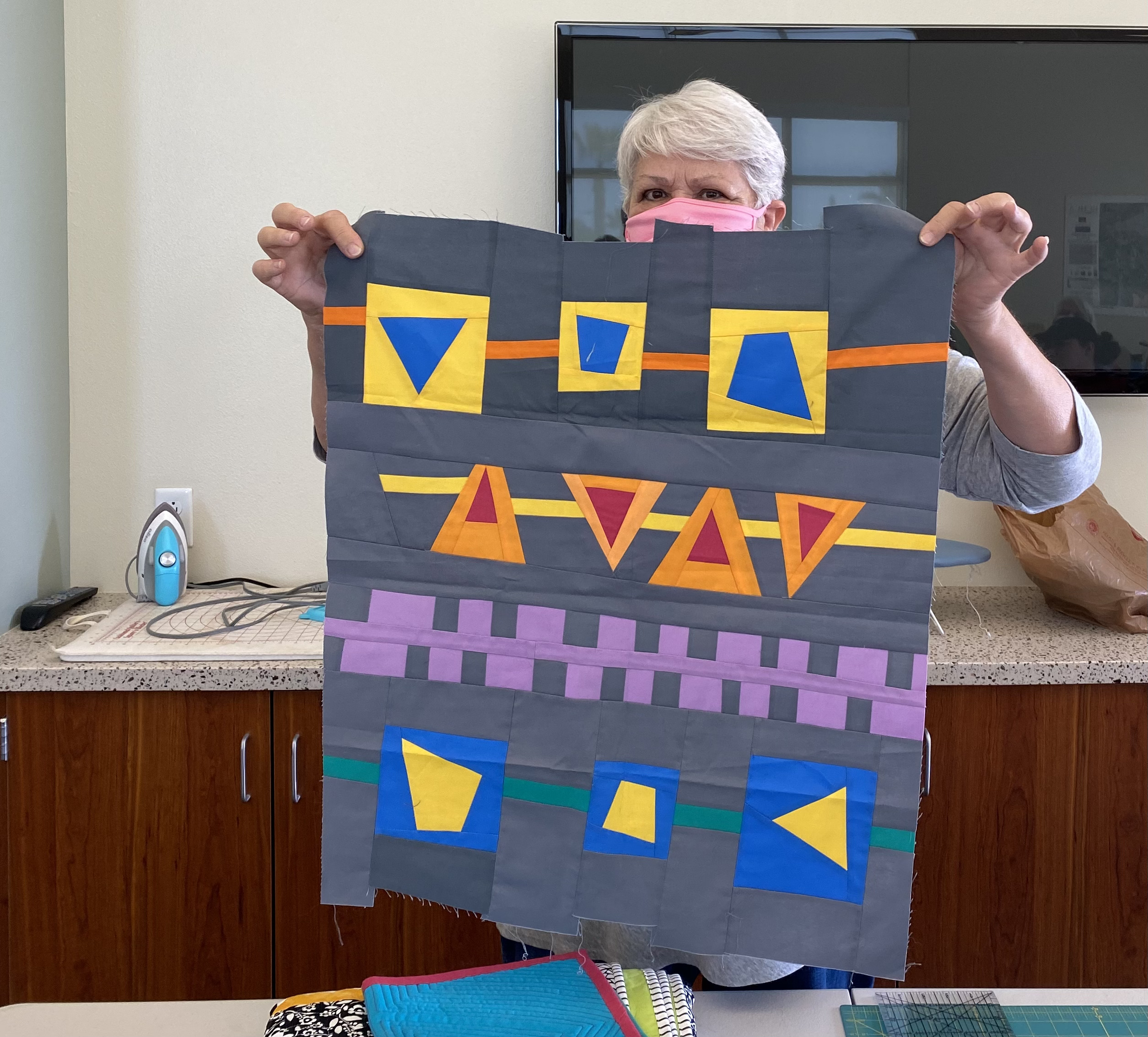 Our April meeting was in person and well attended! We had so much fun learning to sew curves! Guild secretary, Lynn Hanna, taught us to make gentle improve curves by overlapping two pieces of fabric, cutting a gentle curve via rotary cutter, and then sewing with right sides together. It was really that simple! Programs Vice President, Laura Greene, showed us how to turn fabric under for appliquéd curves using card stock for a pattern and aluminum foil for turning the fabric. We all left the meeting having mastered rolling hills and beautiful sunsets. These new skills are sure to help us with our July Round About Challenge .