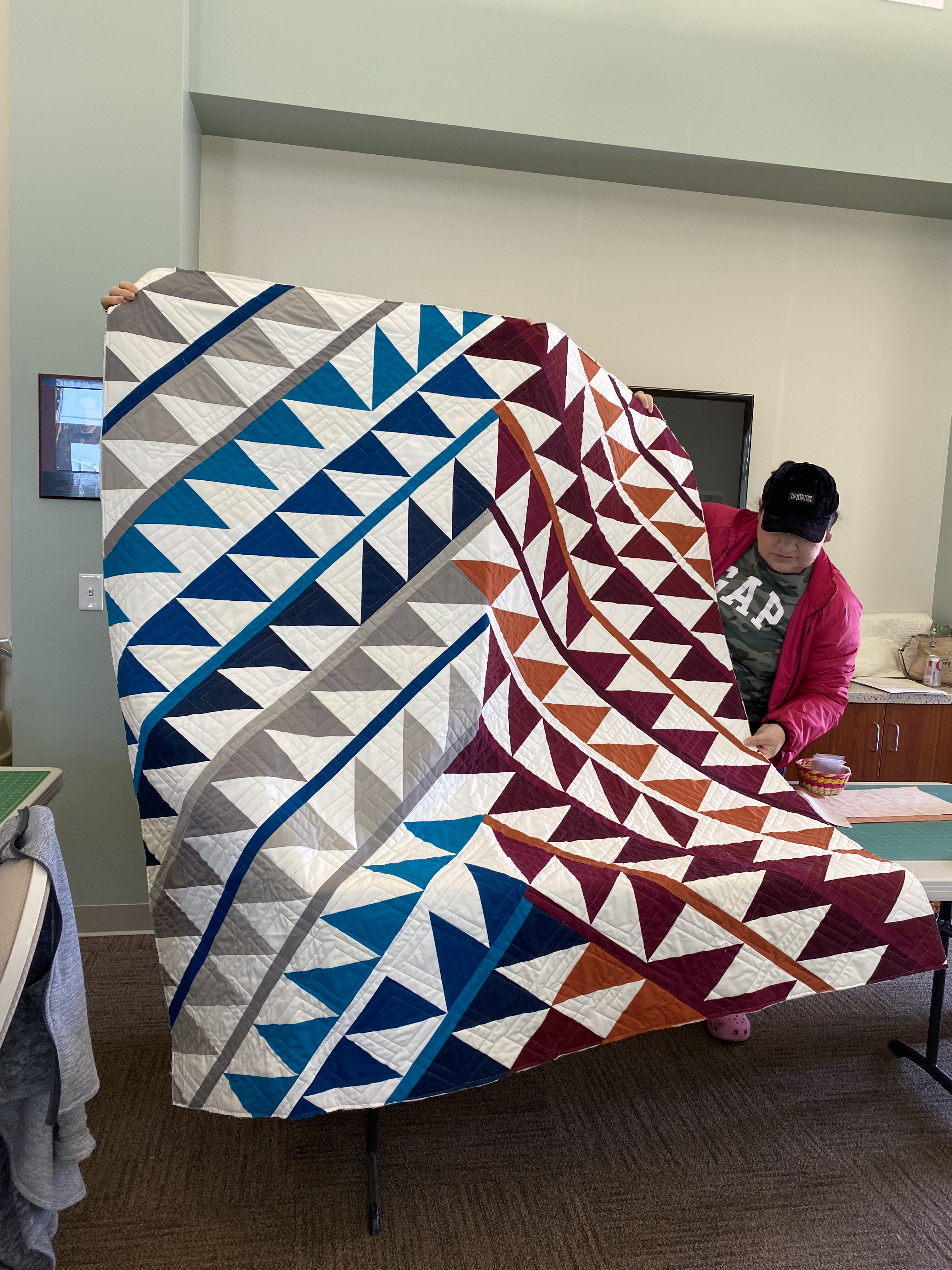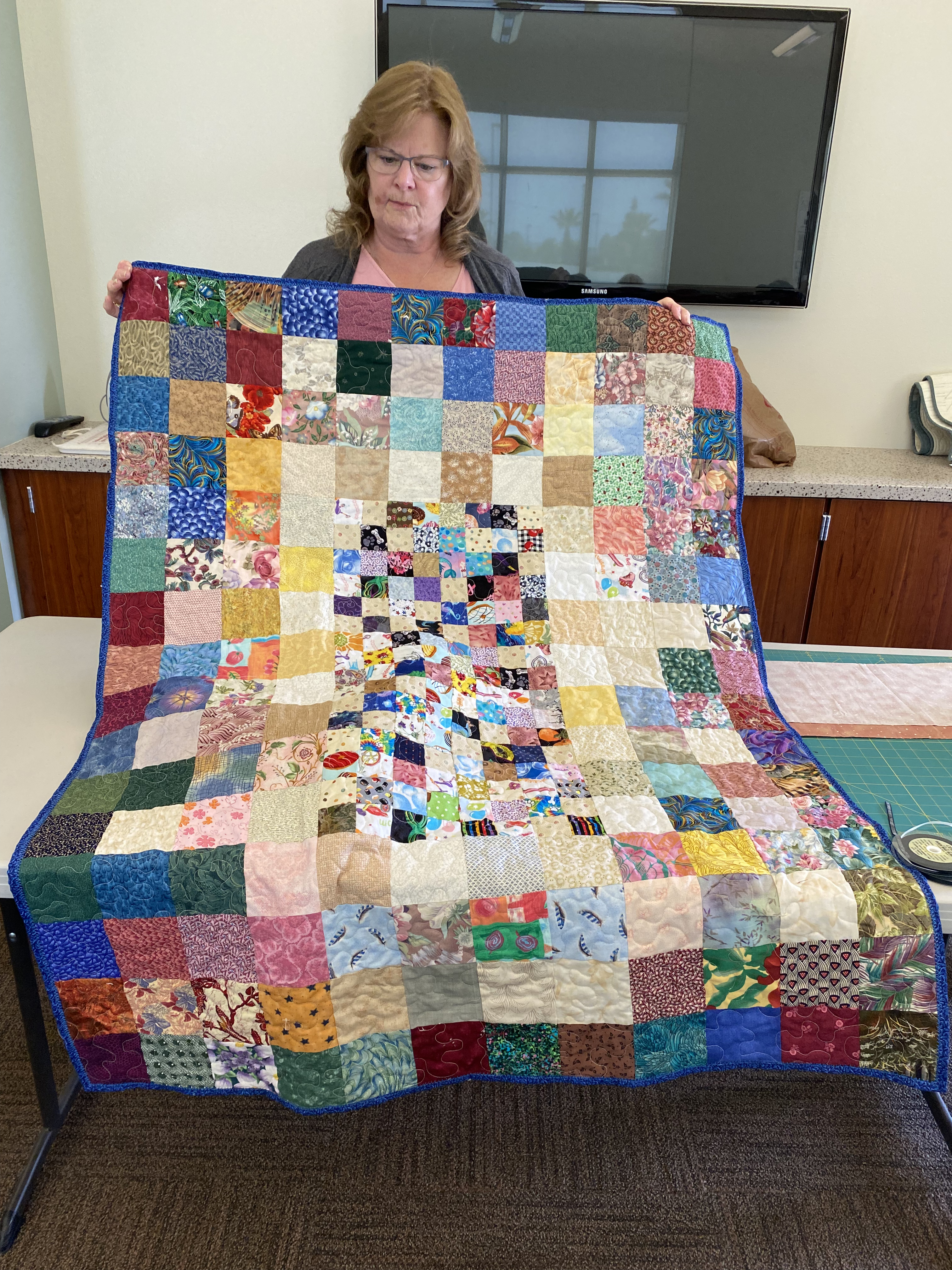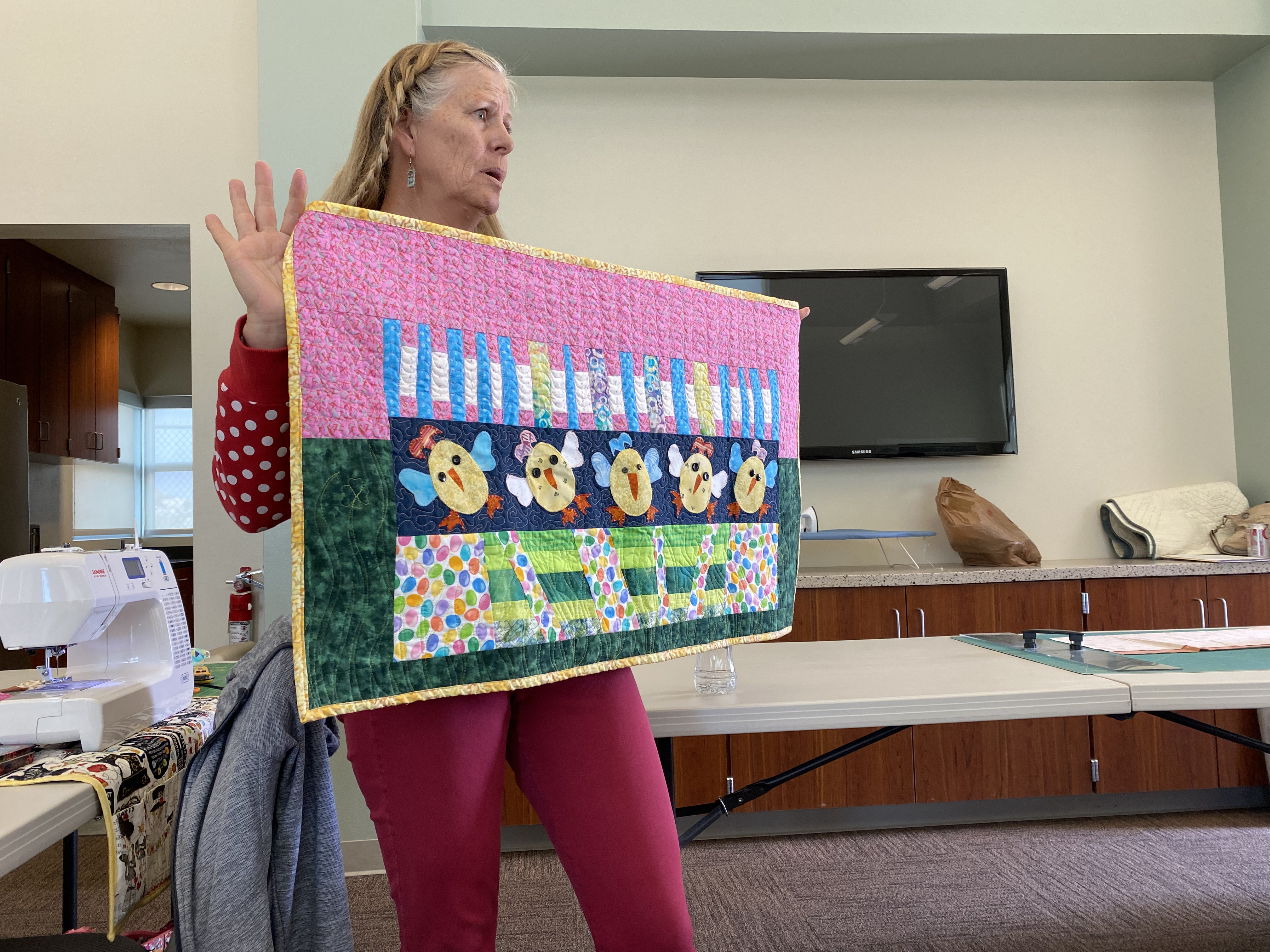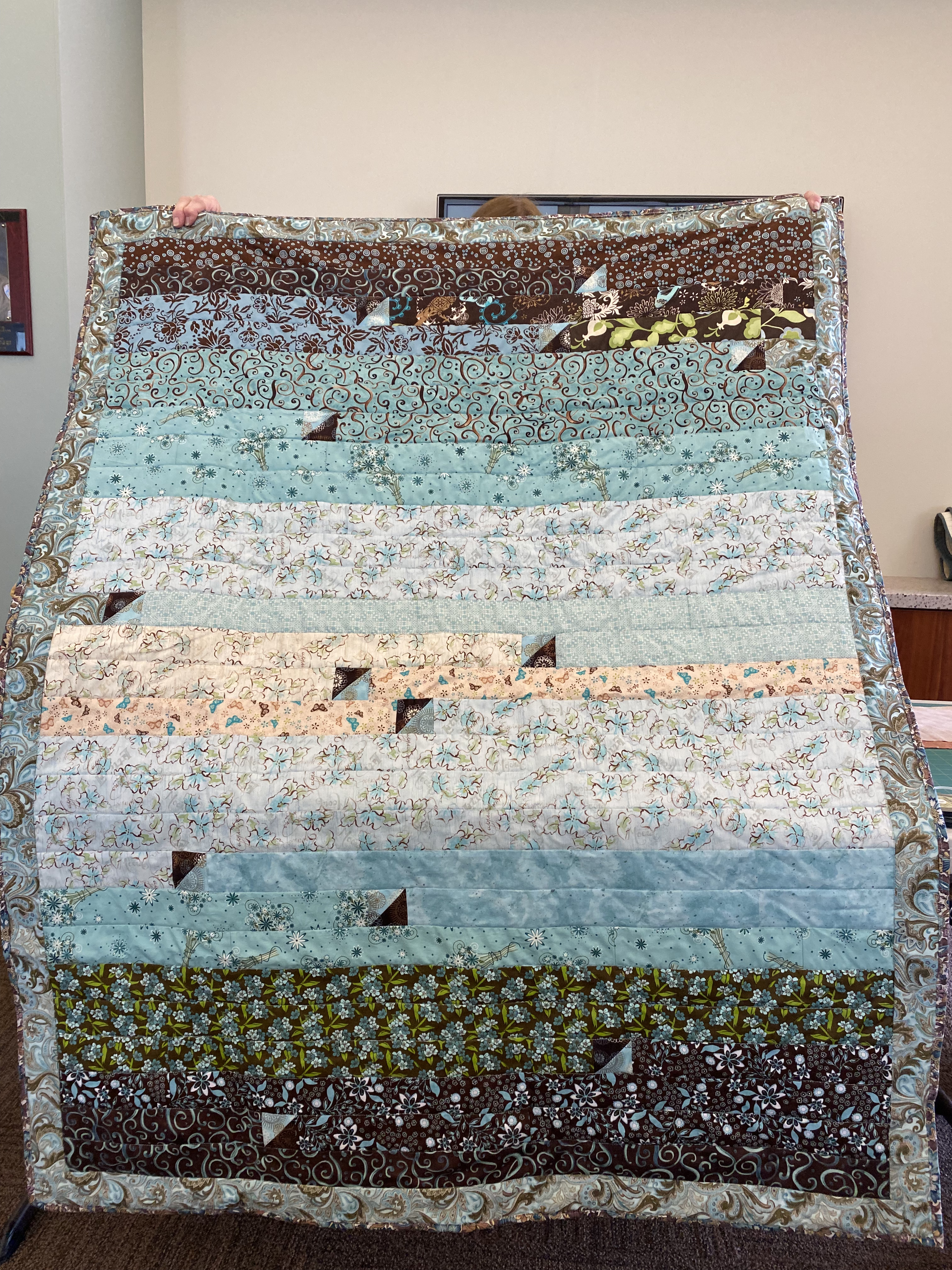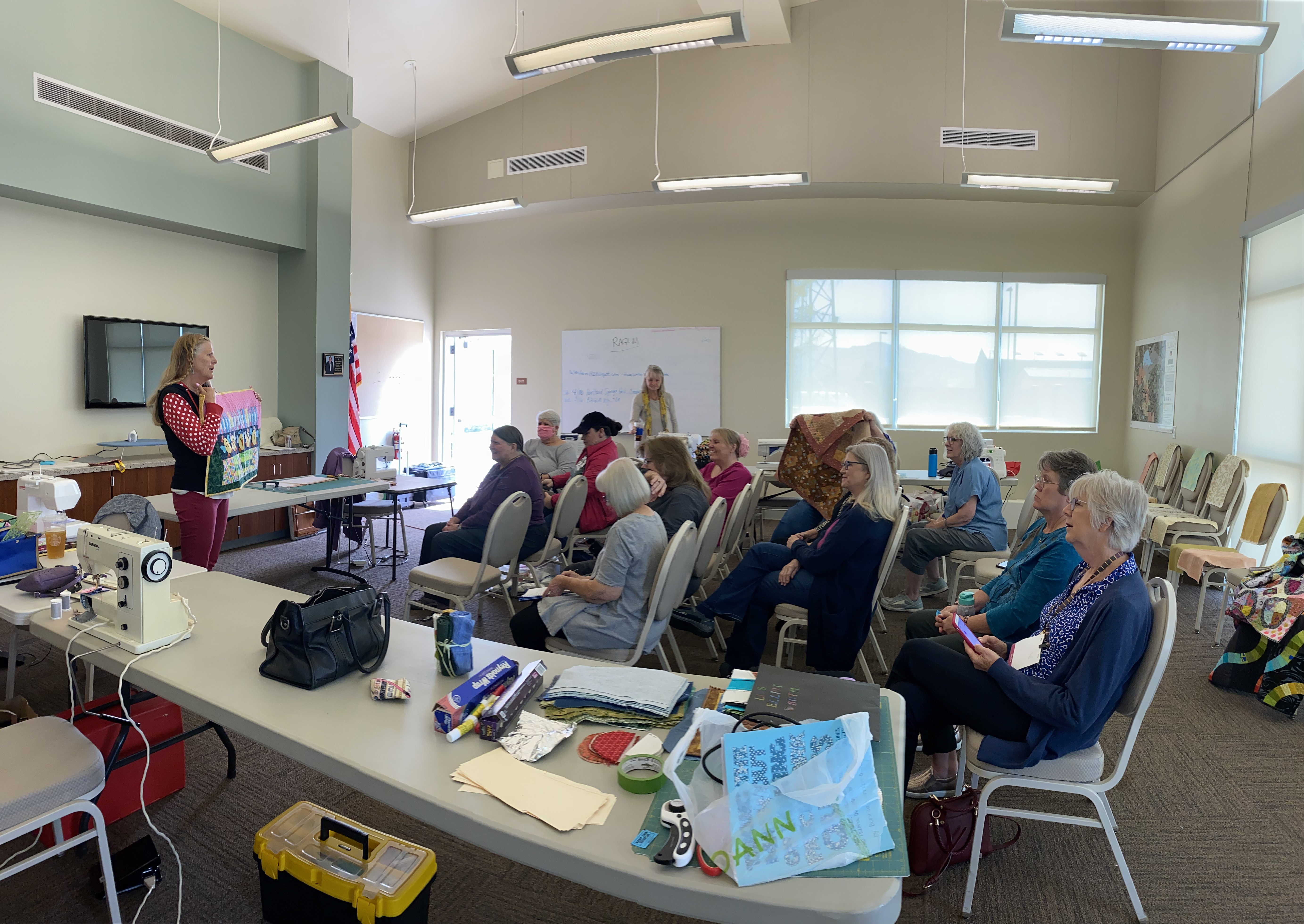 Our April meeting was in person and well attended! We had so much fun learning to sew curves! Guild secretary, Lynn Hanna, taught us to make gentle improve curves by overlapping two pieces of fabric, cutting a gentle curve via rotary cutter, and then sewing with right sides together. It was really that simple! Programs Vice President, Laura Greene, showed us how to turn fabric under for appliquéd curves using card stock for a pattern and aluminum foil for turning the fabric. We all left the meeting having mastered rolling hills and beautiful sunsets. These new skills are sure to help us with our July Round About Challenge .