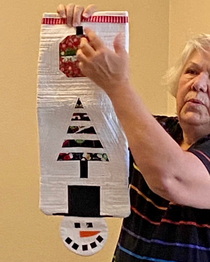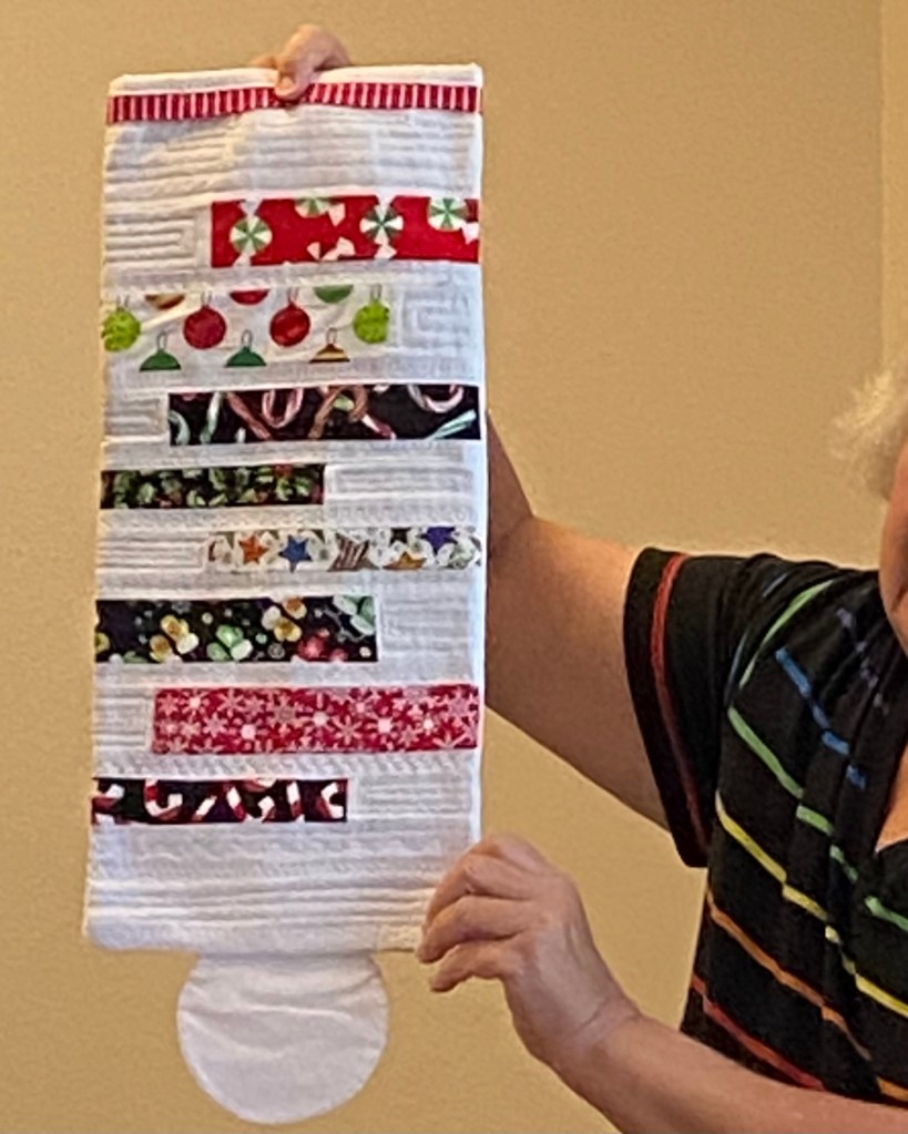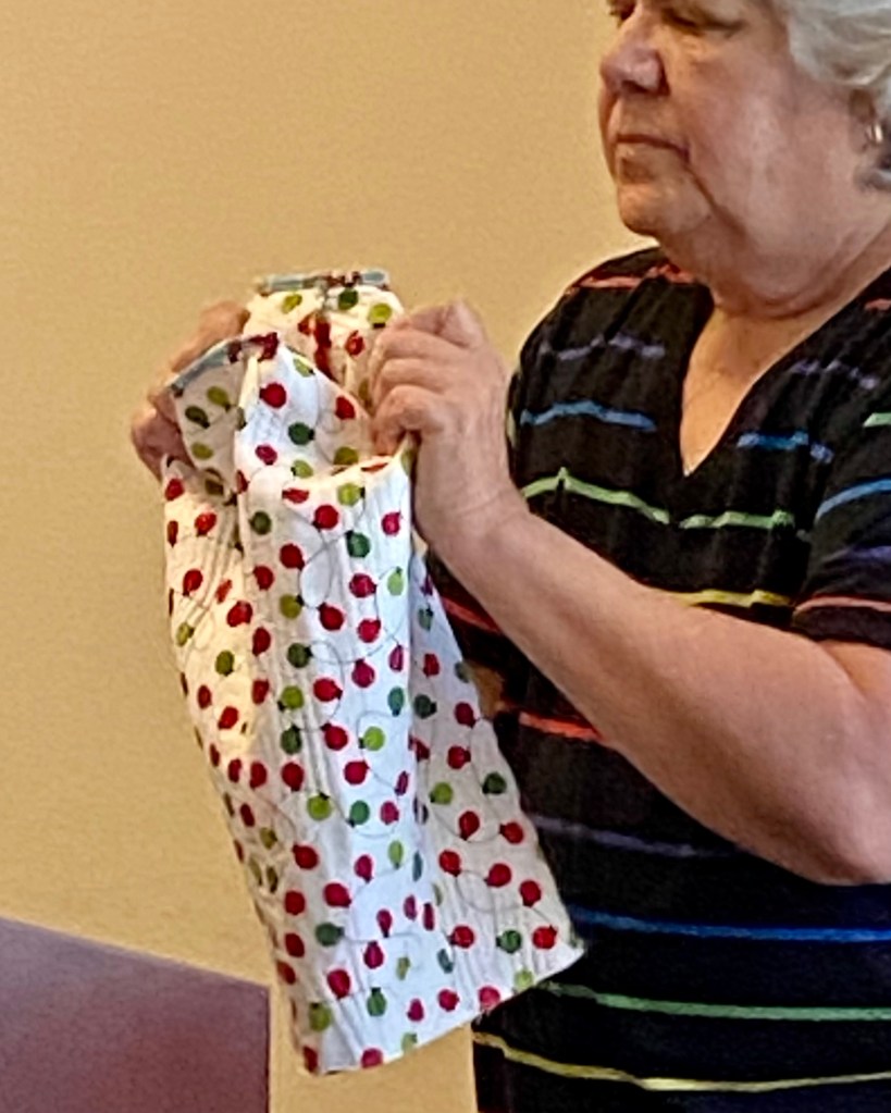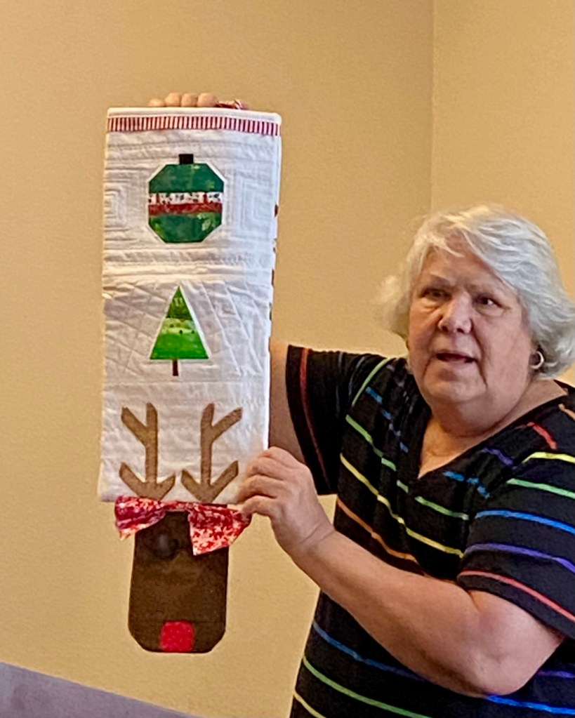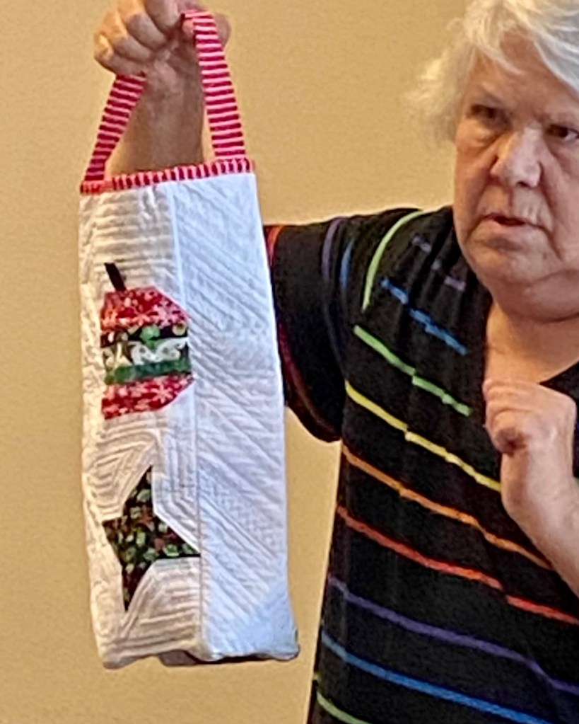 Christine Sharpe demonstrated her twist on quilted Christmas stockings. The steps are easy: make some Christmas blocks, arrange them into a quilt top in your desired height and width, make a quilt sandwich and quilt it. With right sides together, sew closed and bind the sides and bottom, and box the corners. You can customize your stocking by adding a tab or strap for hanging, or you can even add a drawstring top to make it a project bag. Christine showed us so many clever examples, that we Just may need to schedule a sewing day to try these out! Be sure to view the slide show below for Christine’s wonderfully creative stockings.
