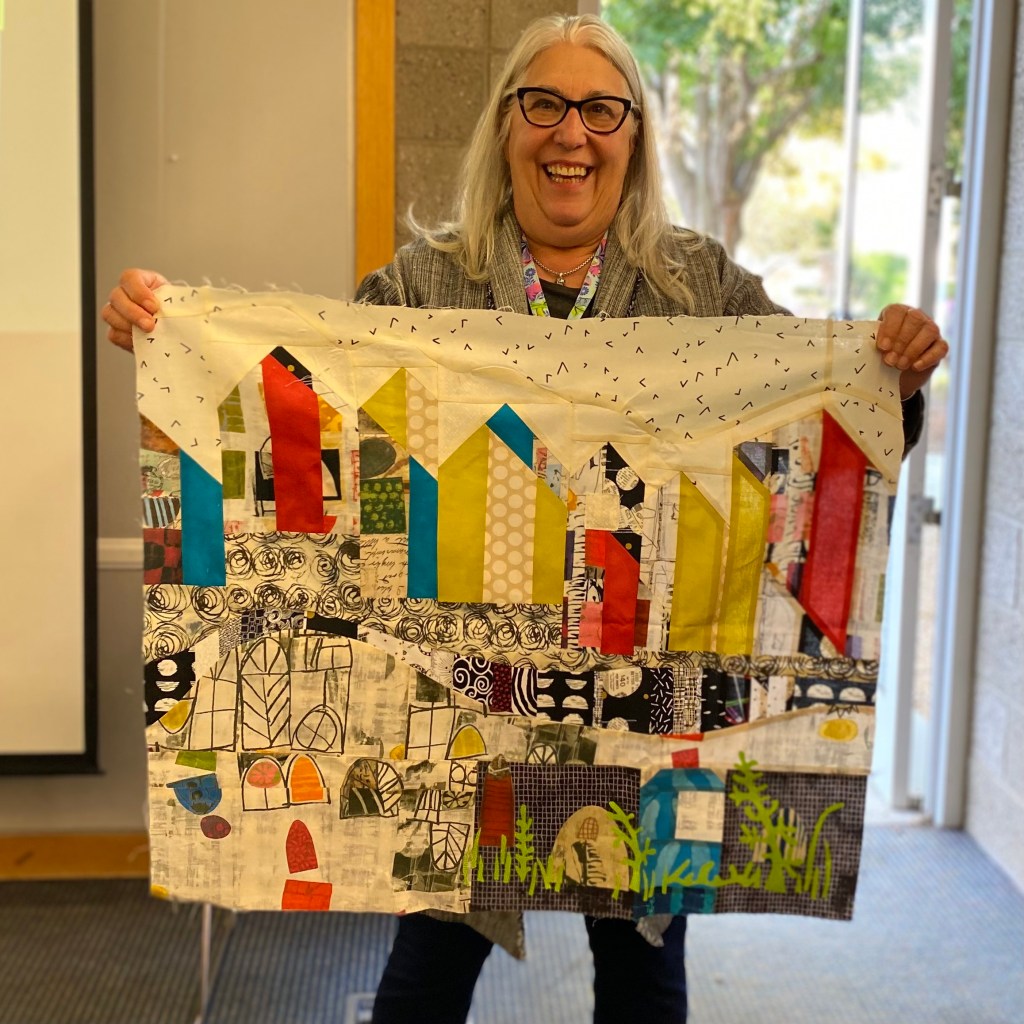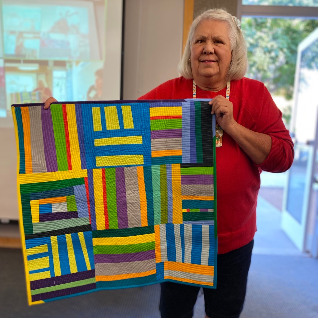 Kelly was accepted into the Windham Fabrics Challenge. Her quilt,”Gear Box” takes one block and distorts it into different shapes. Her quilting amplifies the distortion to make her quilt a real show stopper! Only about 20 percent of the submissions to QuiltCon 2024 were accepted this year.