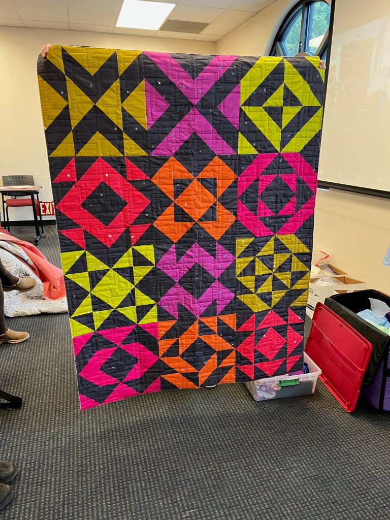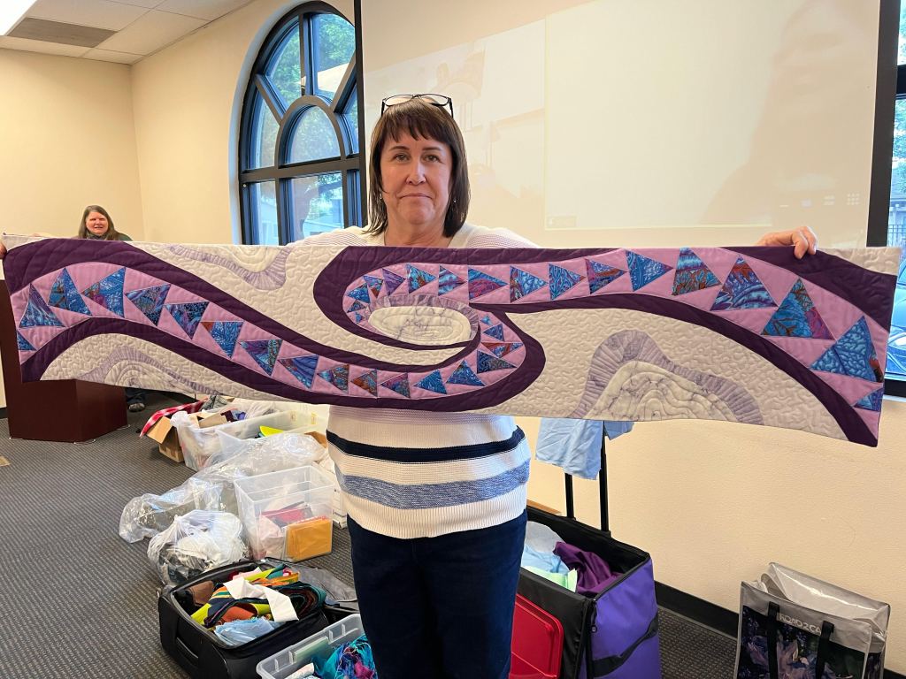 - Out Guide member, Samantha Saturday, spoke about a quilt artist she follows on Instagram: Jennifer Candon with her website is at: https://www.jennifercandon.com/ . Jennifer creates bold works and calls herself a “Textile Muralist”. Samantha showed some images of Jennifer’s studio, creative process and finished works.
