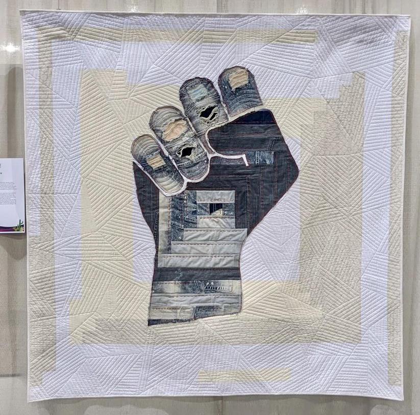 As the 2022 Keynote Speaker, Latifah Saafir Received standing ovations before and after her speech. Her lecture, “Finding My Creative Identity: Standing tall as a Quilter” encouraged us all to find and be true to our inner artist. Latifah’s quilts were featured in a special exhibit at Quiltcon, and while she is well known for her glorious curves, clean lines and bright colors, the quilt shown above was certainly a show stopper. The raised fist evolves from a traditional log cabin block symbolizing strength and structure. It was made from the worn jeans of Steven Taylor, a 33 year old black man who was killed by a police officer just 40 seconds after entering a Walmart in San Leandro, California. Latifah volunteered to make quilts from his clothing for his loved ones. In addition to this quilt, she made three more quilts from Steven’s clothing to comfort his family.