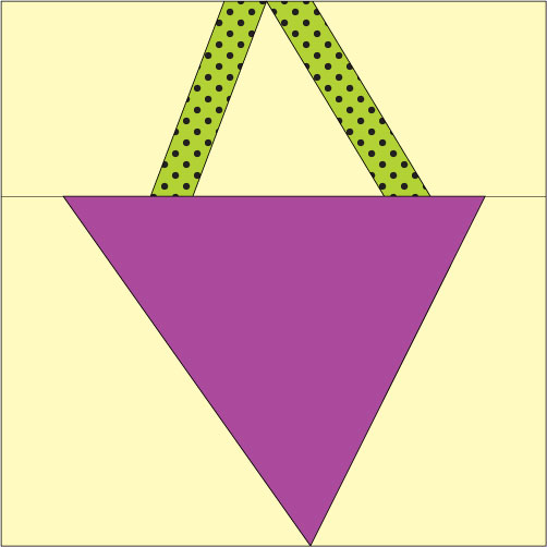 1) Select fabrics for baskets, cut strips 4-1/2″ wide. Lay strips on top of each other, right sides up. Cut basket shapes freehand (with straight edge, optional) changing angle shapes.