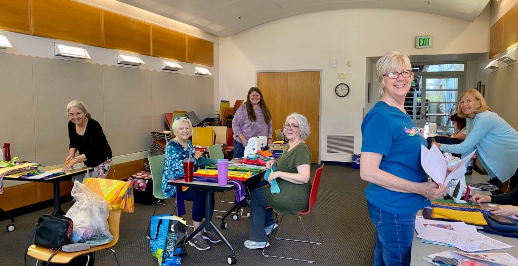 If you missed our sew day, don’t worry. We had so much fun, we’re already planning another. We met Saturday morning at 10 am, and our beloved President, Candy Scott, brought us boxes and boxes of free remnant fabric for charity quilts straight from the Robert Kaufman Co. warehouse. If you would like to take free fabric to make charity quilts, make sure you send us a picture of your finished quilt.