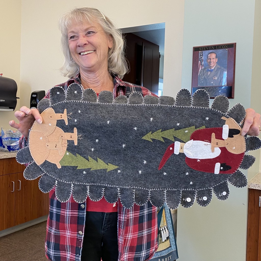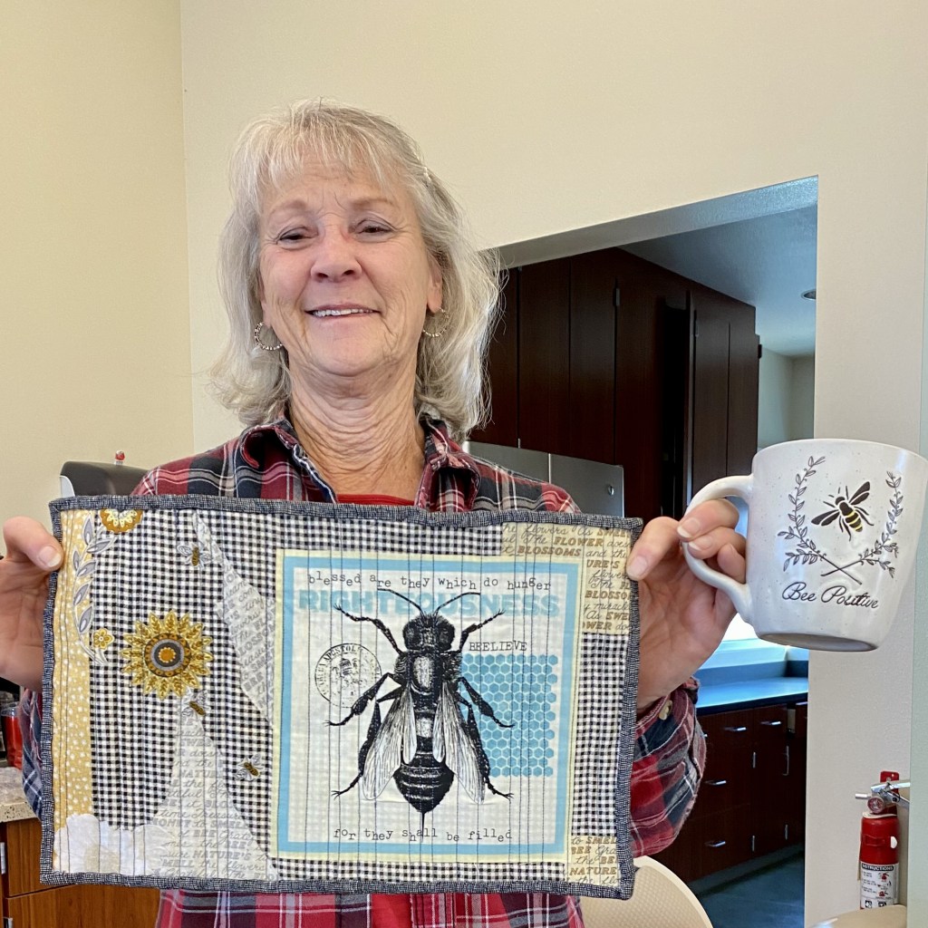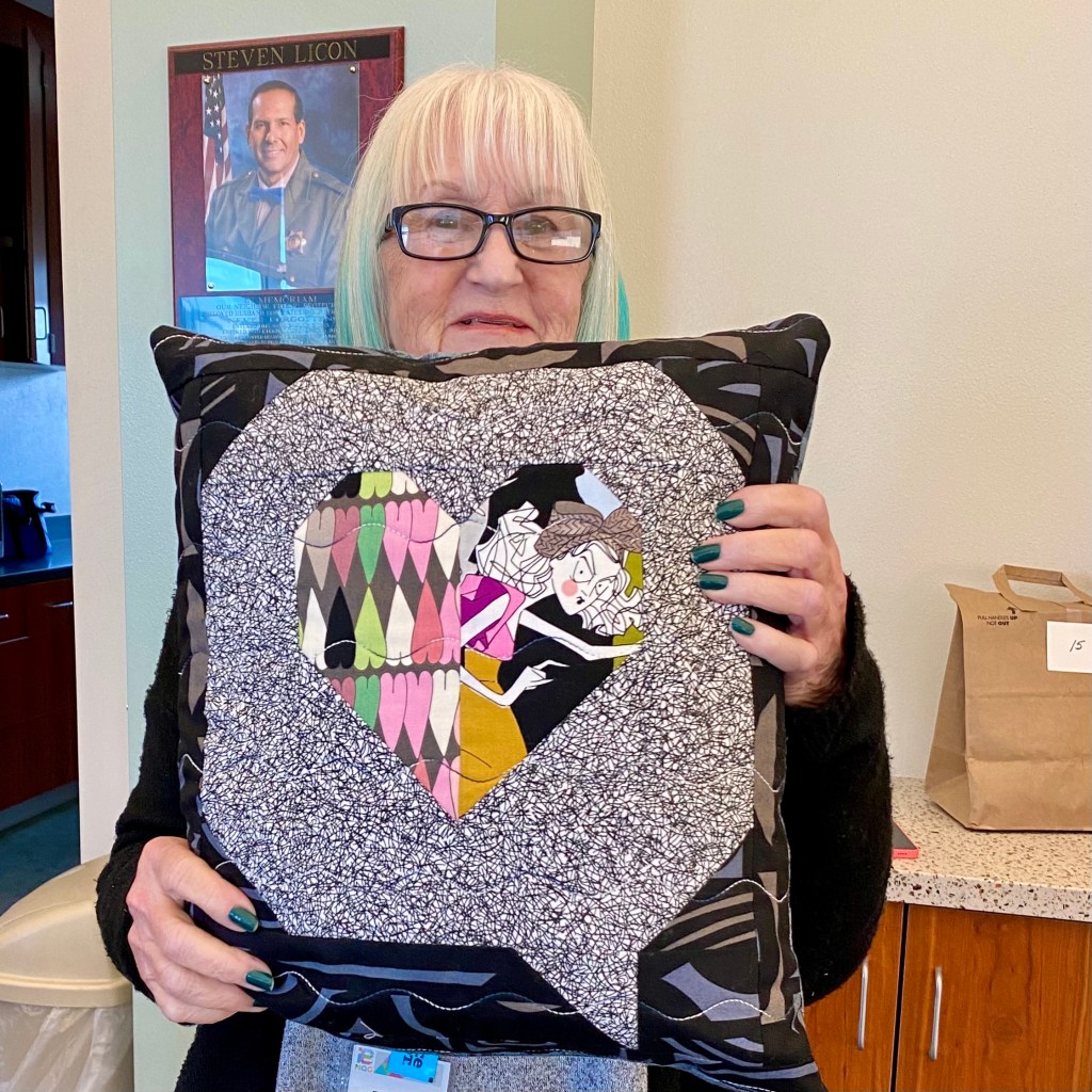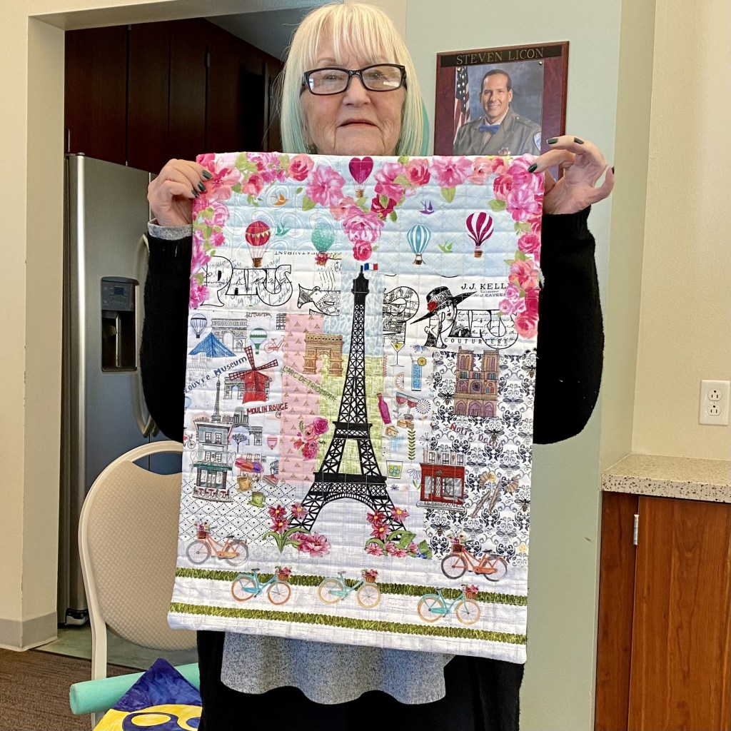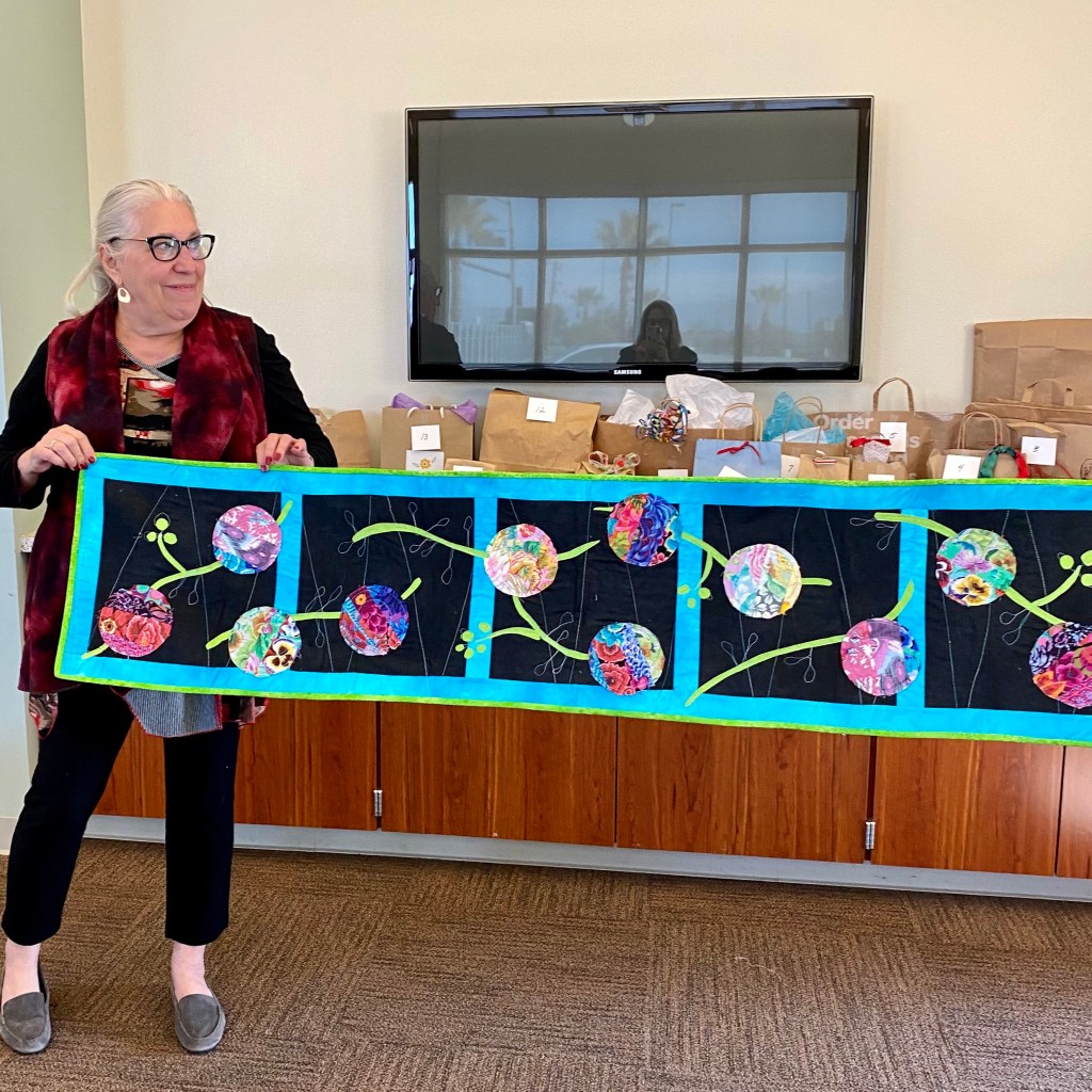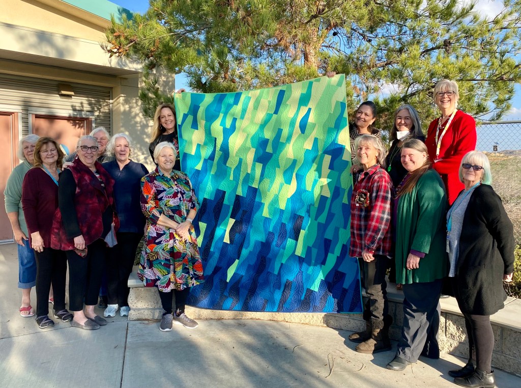 After 3 full sewing days, Quilting by Kelley Bachli and binding by Sharon Berg and Patti Reyes, our quilt is finished and ready for QuiltCon 2023. We had a naming contest with seven clever entries. Members voted for their favorite and Kelley Bachli’s entry “Into the Deep” won. Congratulations Kelley! Thank you to all of our Members who contributed to this fantastic quilt.